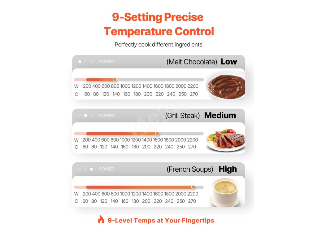 Táto elektrická prenosná indukčná varná doska s výkonom 2200 W sa zohrieva rýchlejšie ako tradičné plynové sporáky, takže varenie je rýchlejšie a jednoduchšie. Nastavte si stupne výkonu, aby ste mohli bez problémov pripravovať polievky, fazuľu, omáčky, cestoviny a ďalšie pokrmy.