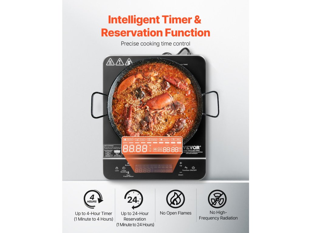 Vďaka absencii otvoreného ohňa je tento indukčný varič bezpečnejší ako väčšina tradičných sporákov. Obsahuje základné bezpečné funkcie, ako je detská poistka, systém automatickej detekcie, pauza a ochrana proti prehriatiu, aby ste mohli variť s pokojom v duši.