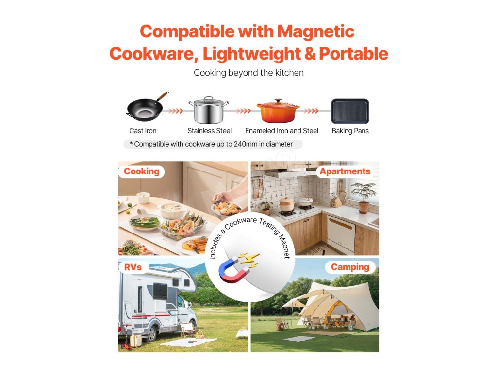 Táto indukčná varná doska je navrhnutá pre magnetický riad s priemerom dna pod 240 mm, zaberá minimum miesta na kuchynskej linke, je vysoko prenosná a ľahko skladovateľná, ideálna na varenie na cestách.