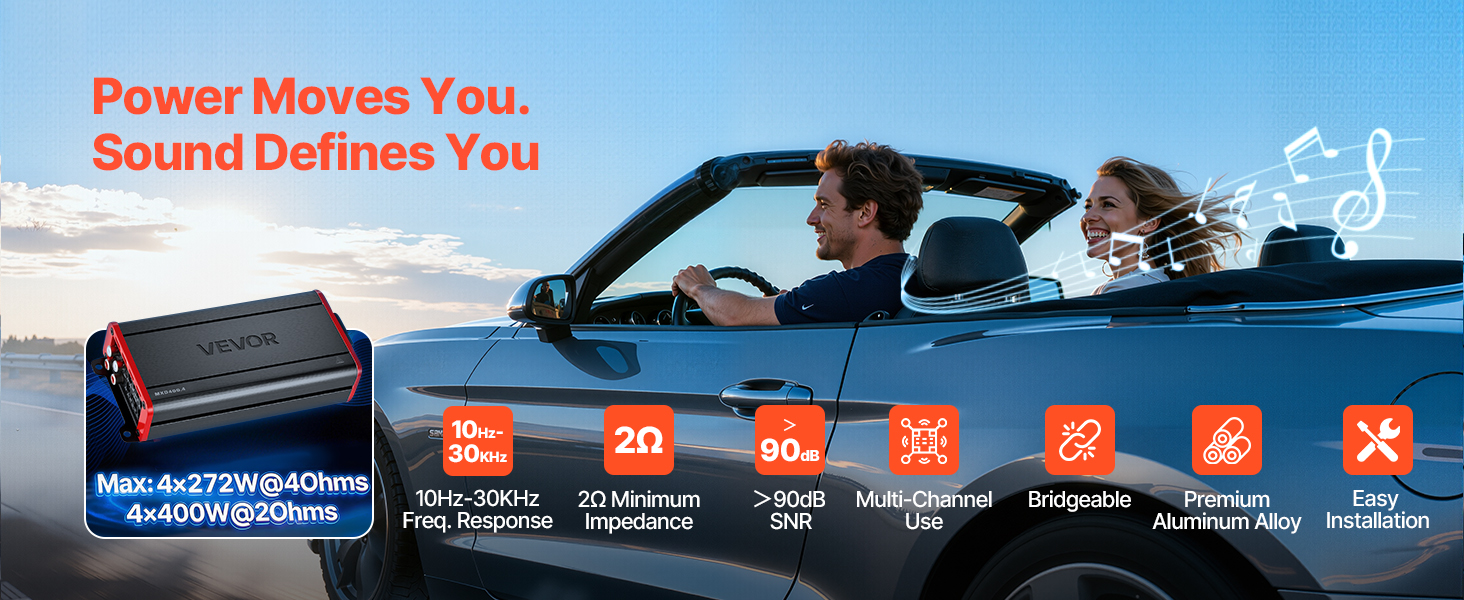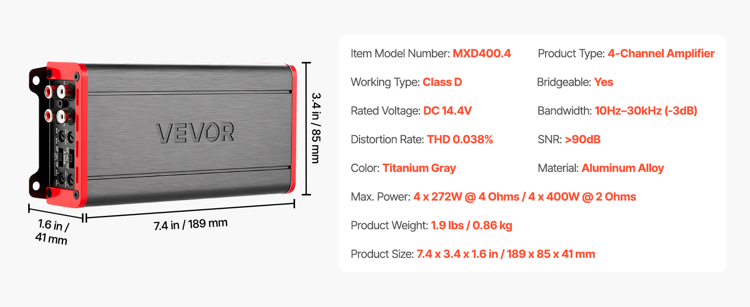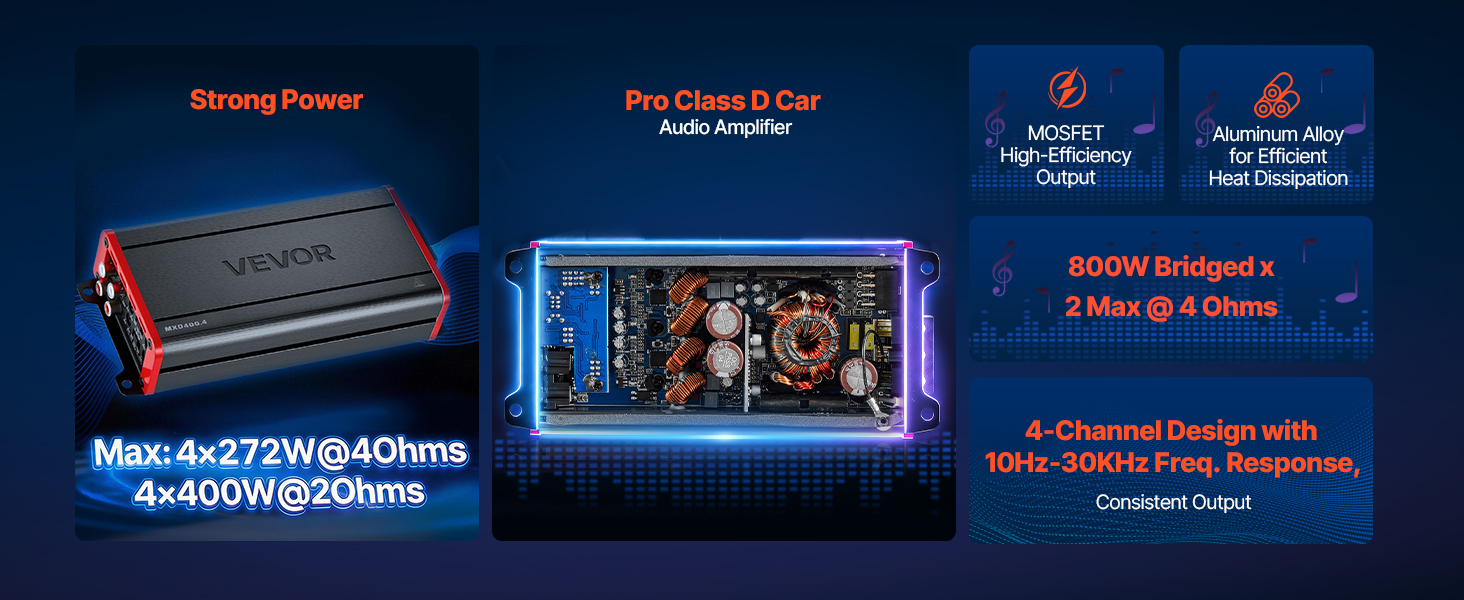 Tento viackanálový zosilňovač pre autorádio ponúka vysoký výkon, čistý zvuk s nízkym skreslením a mostovateľné kanály. Vďaka vysokému pomeru signálu k šumu, plynulému výkonu triedy D a odvodu tepla z hliníkovej zliatiny sa hodí do rôznych vozidiel a ľahko sa inštaluje – je ideálny pre každodenné jazdenie aj pre audio nadšencov.