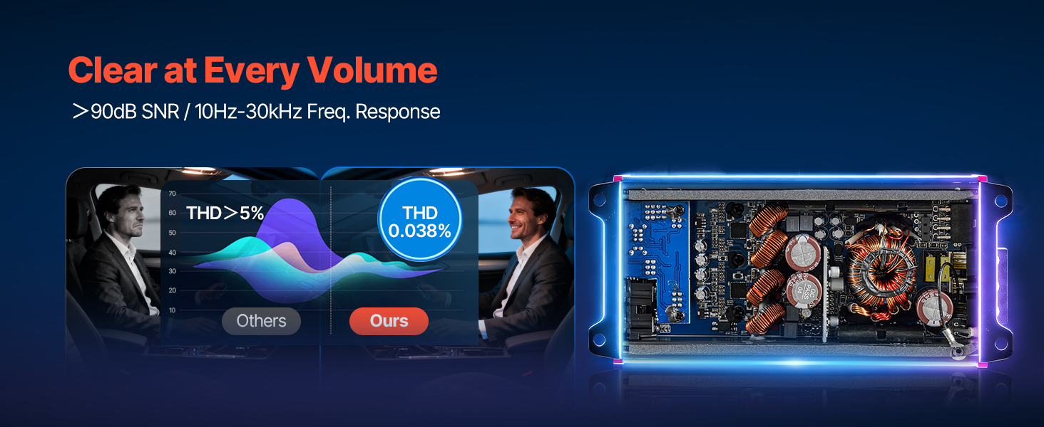 Tento 4-kanálový zosilňovač, vyrobený s využitím sofistikovanej technológie s nízkym skreslením, zachováva vašu hudbu vernú a transparentnú a poskytuje realistické detaily a plynulé prehrávanie – aj keď zvýšite hlasitosť.