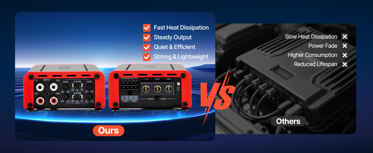 Náš 4-kanálový zosilňovač je navrhnutý pre použitie v sedanoch, SUV, terénnych vozidlách a športových autách, čím zabezpečuje bezproblémovú integráciu s takmer akýmkoľvek 12 V systémom vozidla.