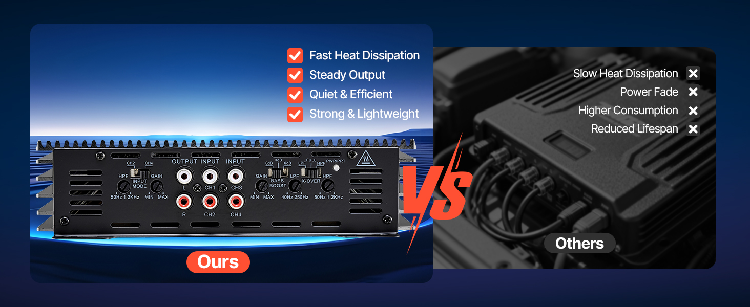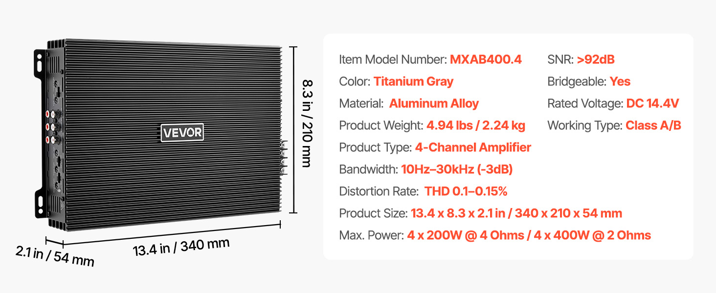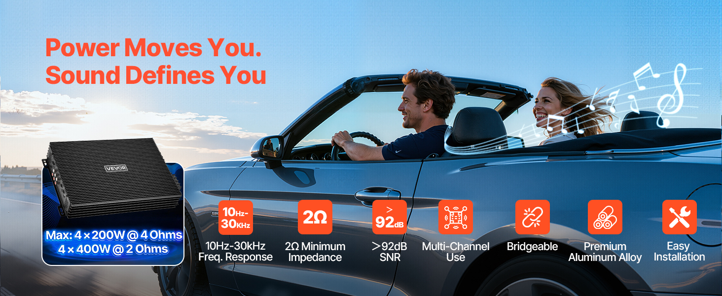 Tento viackanálový zosilňovač pre autorádio ponúka vysoký výkon, čistý zvuk s nízkym skreslením a mostíkovateľné kanály. Vďaka vysokému pomeru signálu k šumu, plynulému výkonu triedy AB a odvodu tepla z hliníkovej zliatiny sa hodí do rôznych vozidiel a ľahko sa inštaluje – je ideálny pre každodenné jazdenie aj pre audio nadšencov.