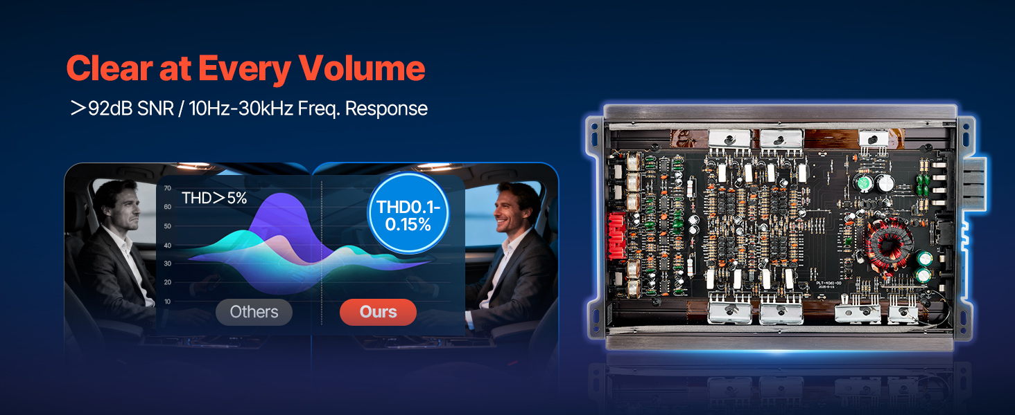 Tento 4-kanálový zosilňovač, vyrobený s využitím sofistikovanej technológie s nízkym skreslením, zachováva vašu hudbu vernú a transparentnú a poskytuje realistické detaily a plynulé prehrávanie – aj keď zvýšite hlasitosť.