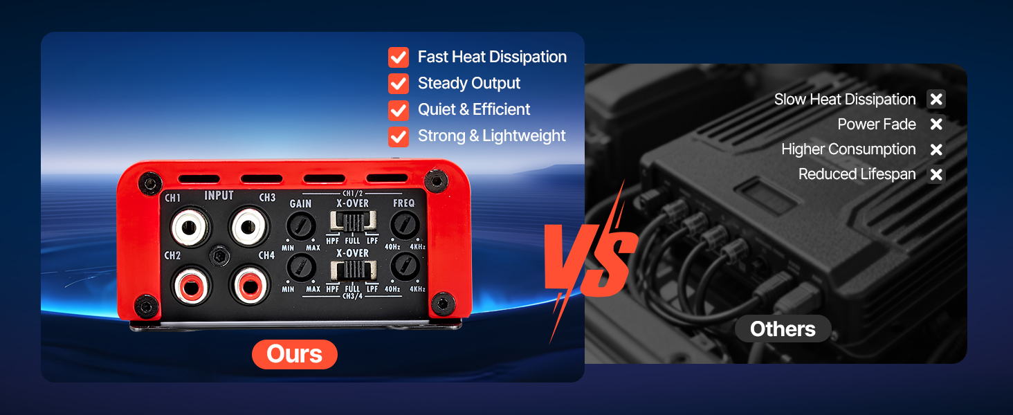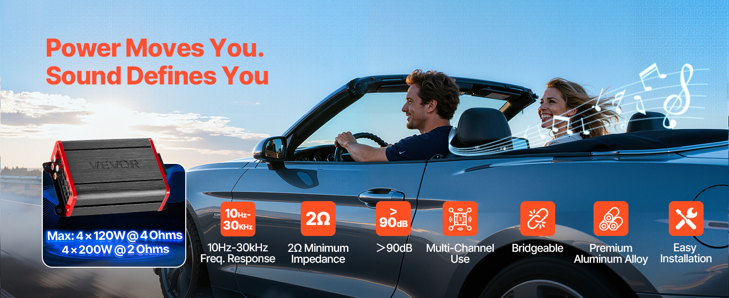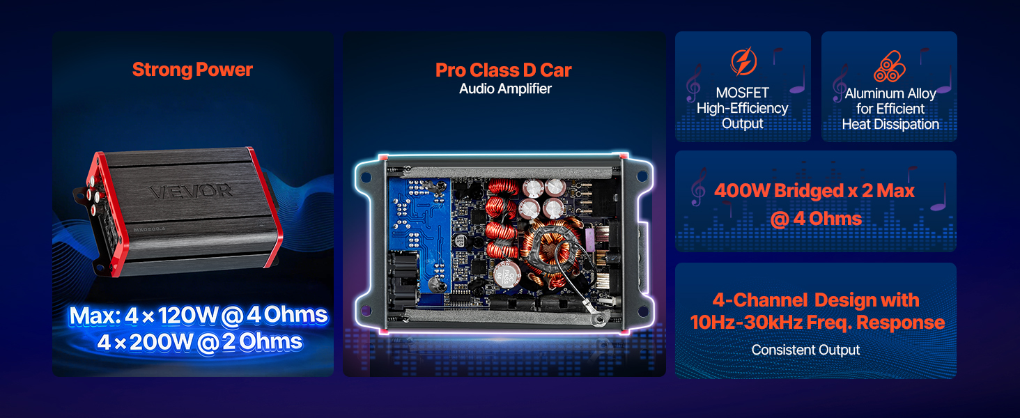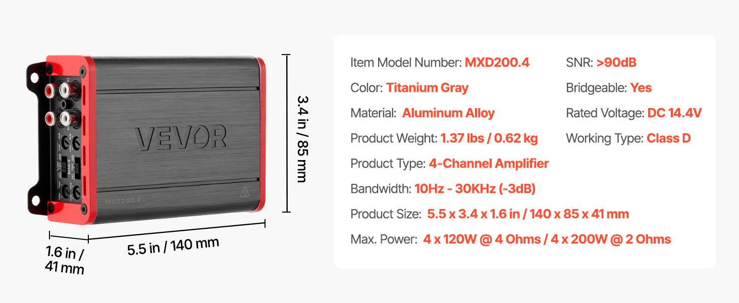 Tento viackanálový zosilňovač pre autorádio ponúka vysoký výkon, čistý zvuk s nízkym skreslením a mostovateľné kanály. Vďaka vysokému pomeru signálu k šumu, plynulému výkonu triedy D a odvodu tepla z hliníkovej zliatiny sa hodí do rôznych vozidiel a ľahko sa inštaluje – je ideálny pre každodenné jazdenie aj pre audio nadšencov.