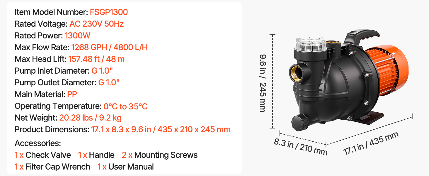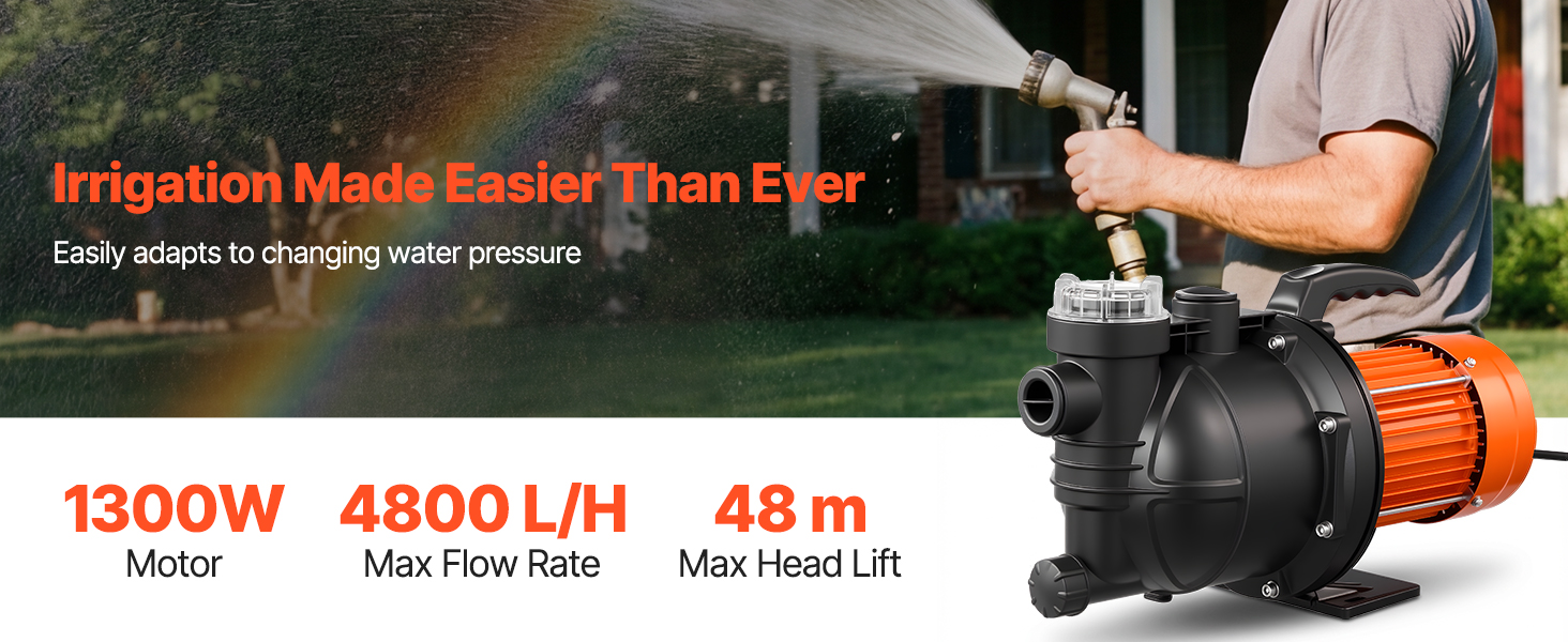Určené pre domáce záhrady a zavlažovanie malých fariem. Naše čerpadlo je vybavené vstupným otvorom G1,0 a predfiltrom, aby vyhovovalo väčšine európskych potrubných systémov. S motorom s výkonom 1300 W, maximálnym prietokom 4800 l/h, maximálnou výškou 48 m a sacím výkonom 8 m ľahko čerpá vodu z plytkých studní a podporuje dodávku vody do viacerých poschodí.