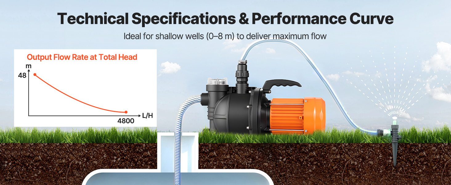Toto zavlažovacie čerpadlo do plytkej studne, poháňané motorom s výkonom 1300 W, poskytuje silný prietok vody až 4800 l/h. Vďaka ľahkej konštrukcii sa ľahko prenáša a je ideálne na zavlažovanie záhrad, napúšťanie bazénov a čerpanie vody na poľnohospodárskej pôde s konzistentnou účinnosťou.
