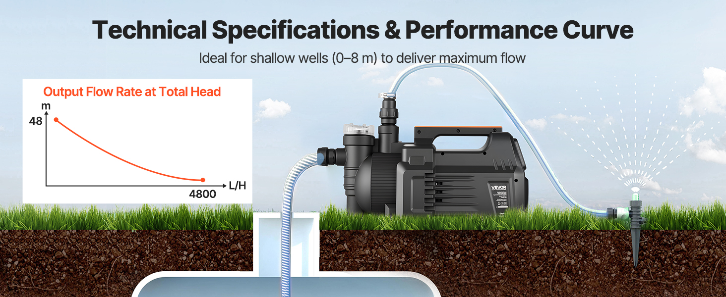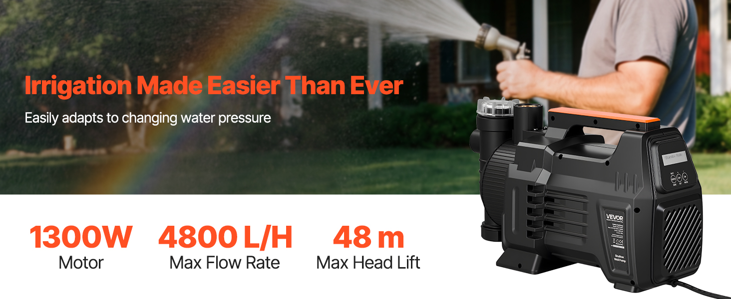Toto zavlažovacie čerpadlo pre plytké studne, poháňané motorom s výkonom 1300 W, poskytuje prietok až 4800 l/h a maximálnu výšku zdvihu 48 m. Elektronický tlakový spínač (1,6–5 bar) umožňuje automatické spustenie/vypnutie, čím zabezpečuje efektívnu prevádzku pri zavlažovaní, napúšťaní bazénov a zásobovaní farmy vodou.