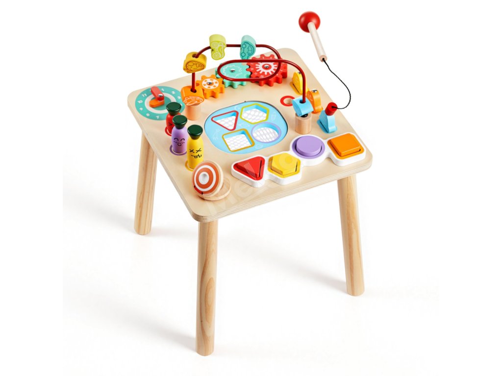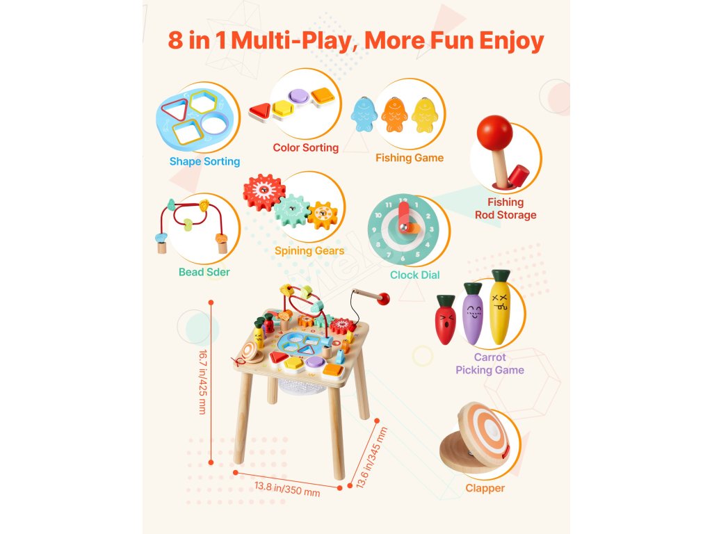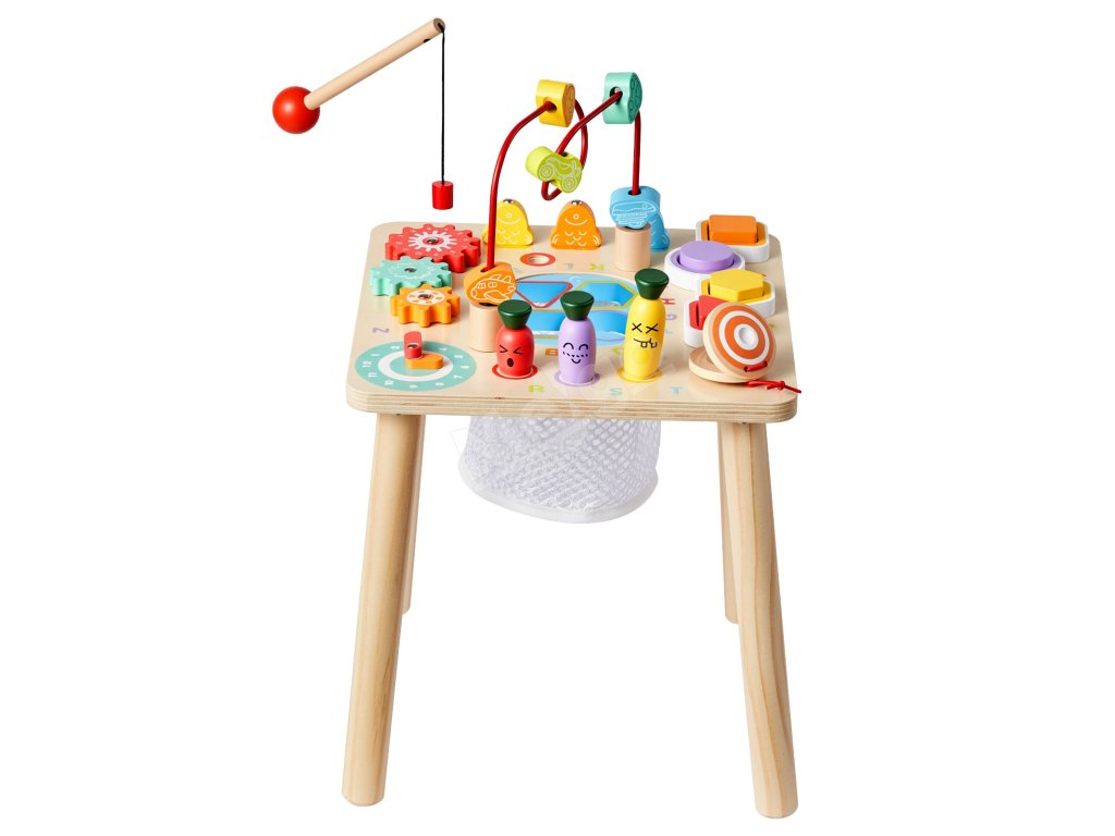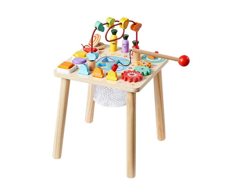 Tento vzdelávací stôl kombinuje triedenie farieb a tvarov, rybársku hru, bludisko s korálikmi, otočné ozubené kolesá, pohyblivú ručičku hodín, zbieranie mrkvy a rytmický pad. Farebné diely a hra „ťukni a počuj“ podporujú sústredenie, predstavivosť a tvorivé príbehy.