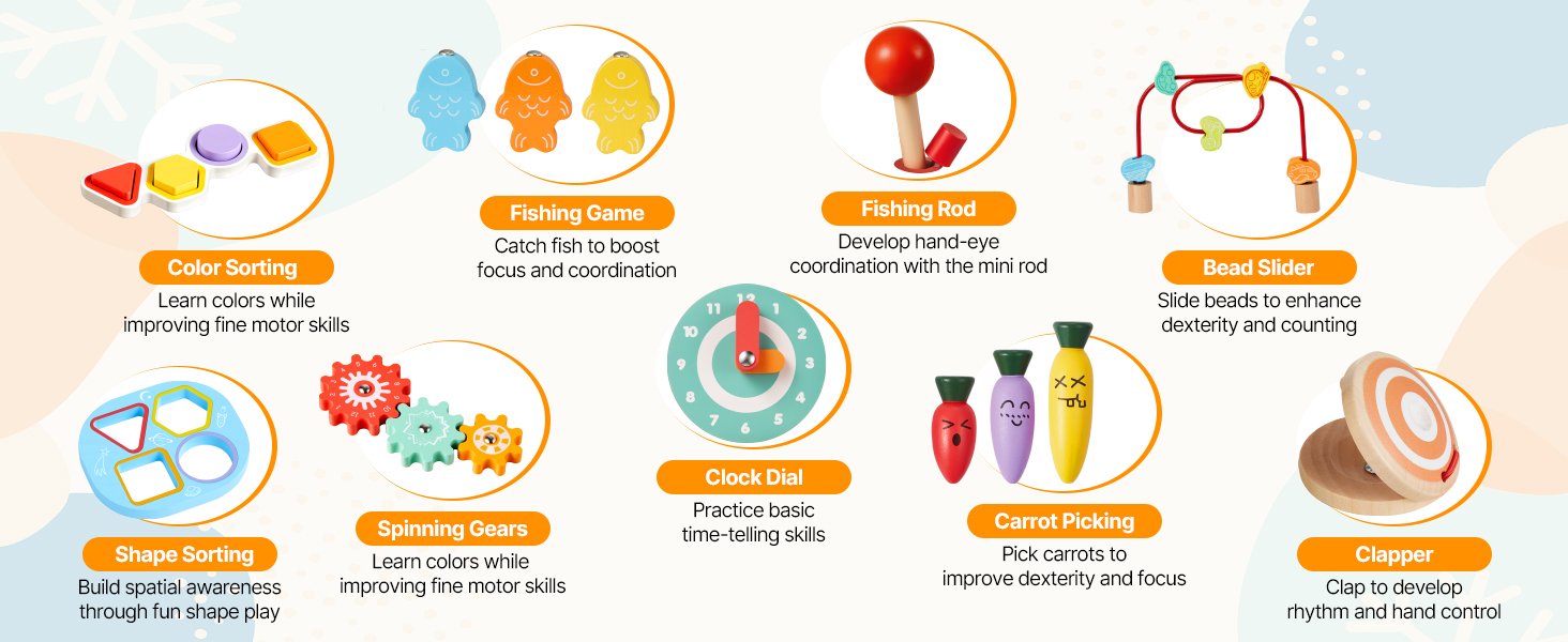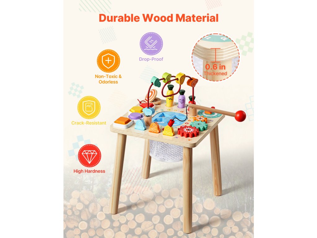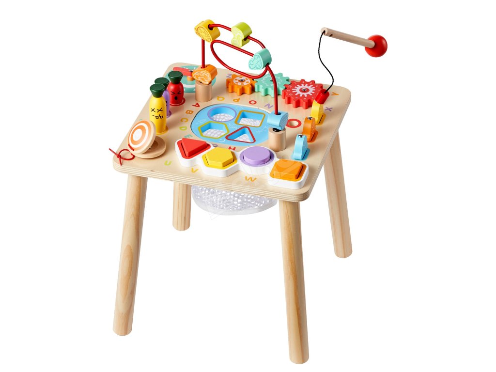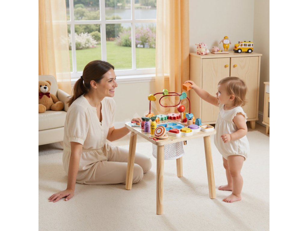 Tento vzdelávací stôl kombinuje triedenie farieb a tvarov, rybársku hru, bludisko s korálikmi, otočné ozubené kolesá, pohyblivú ručičku hodín, zbieranie mrkvy a rytmický pad. Farebné diely a hra „ťukni a počuj“ podporujú sústredenie, predstavivosť a tvorivé príbehy.