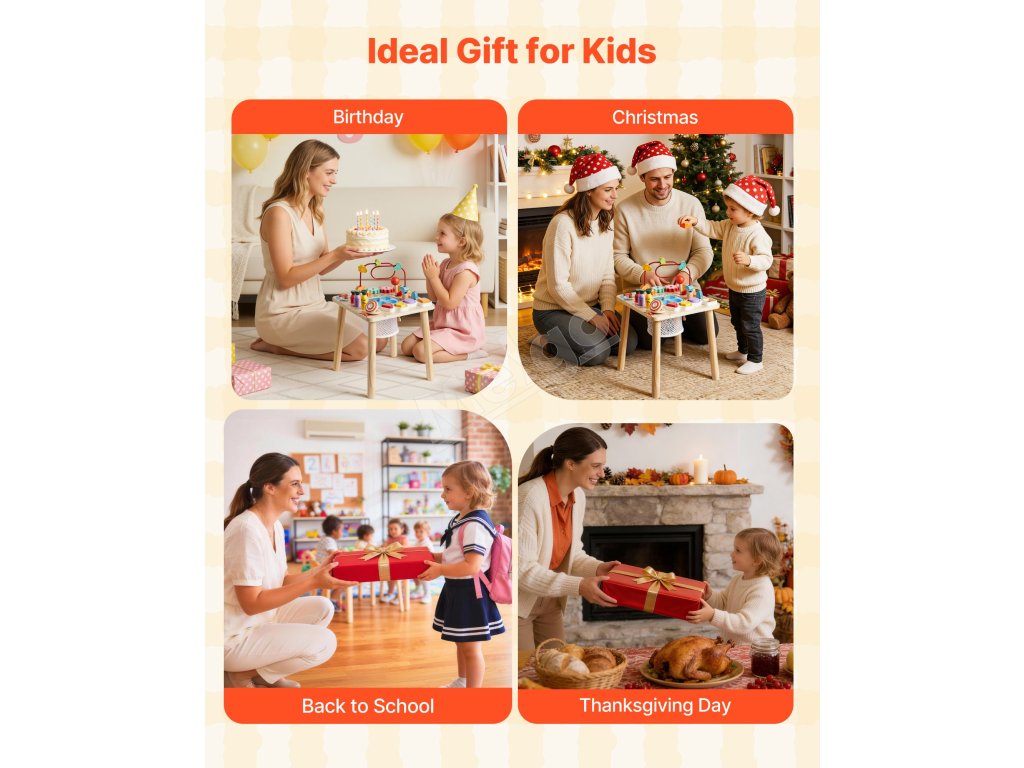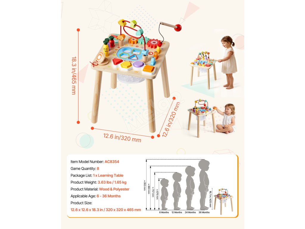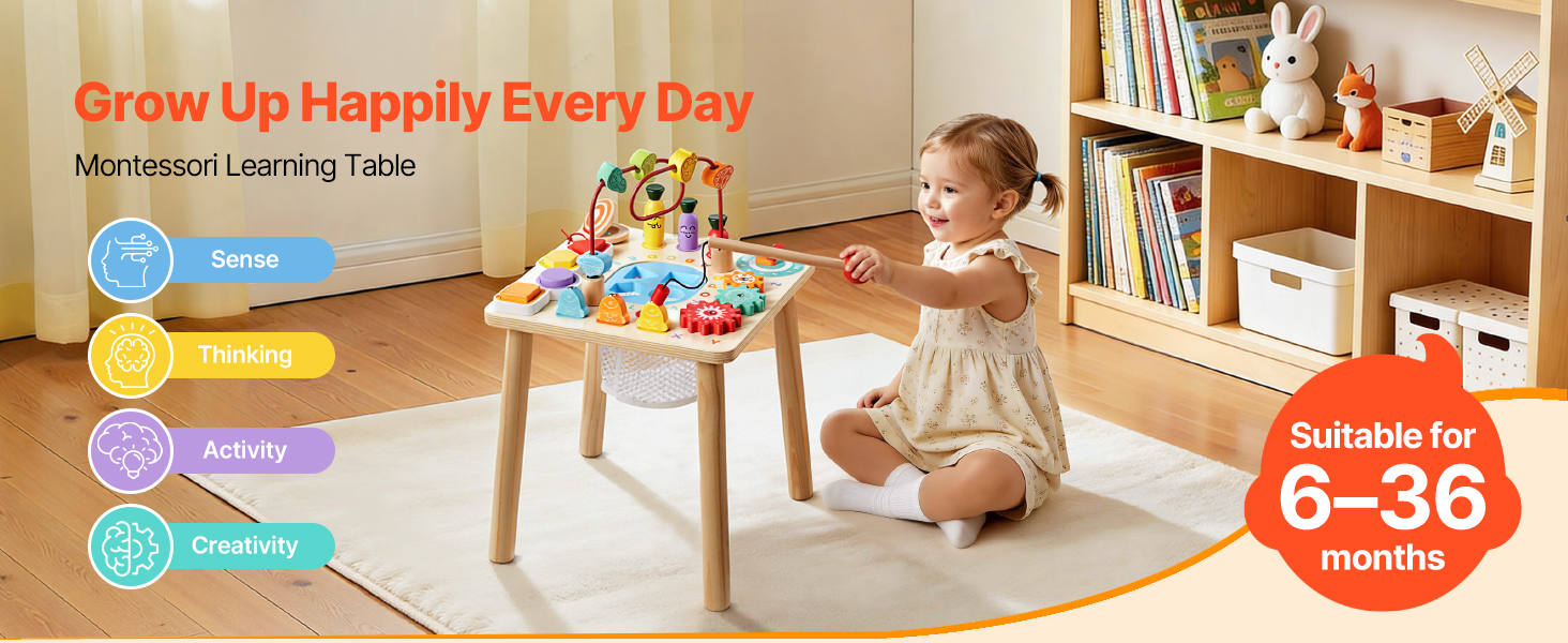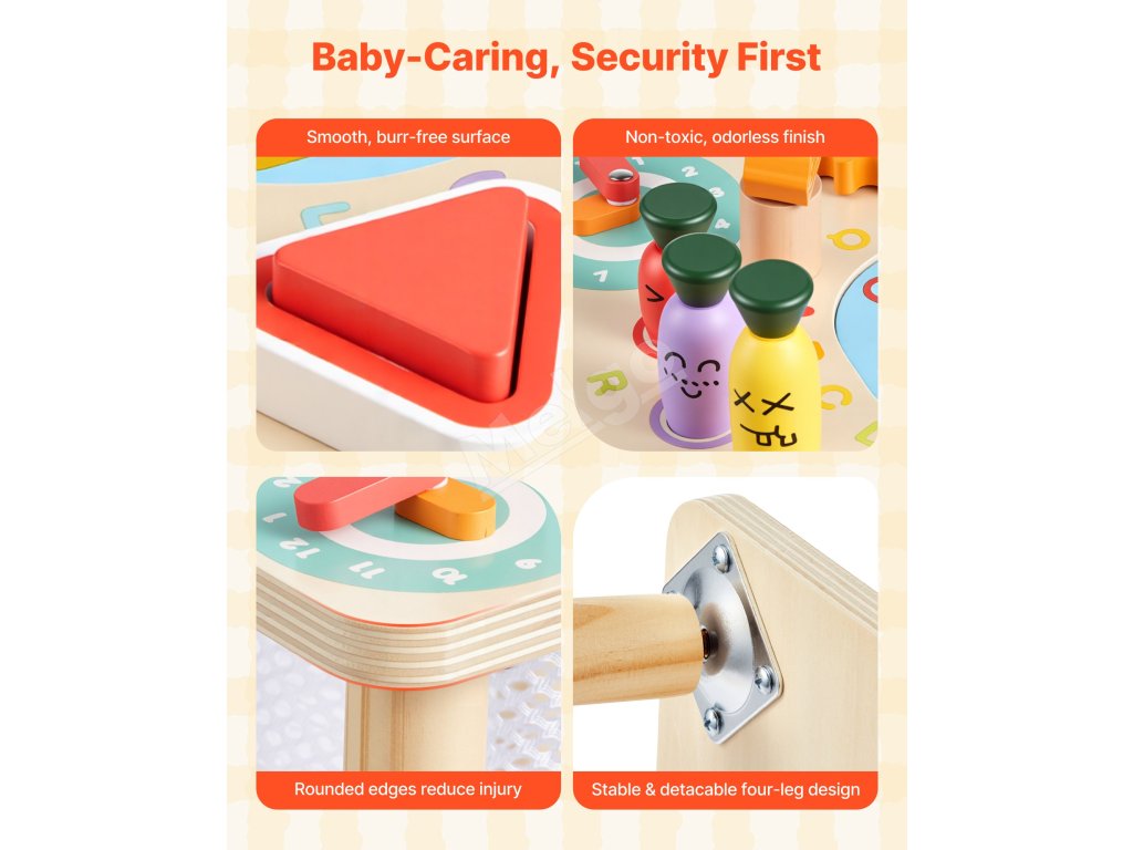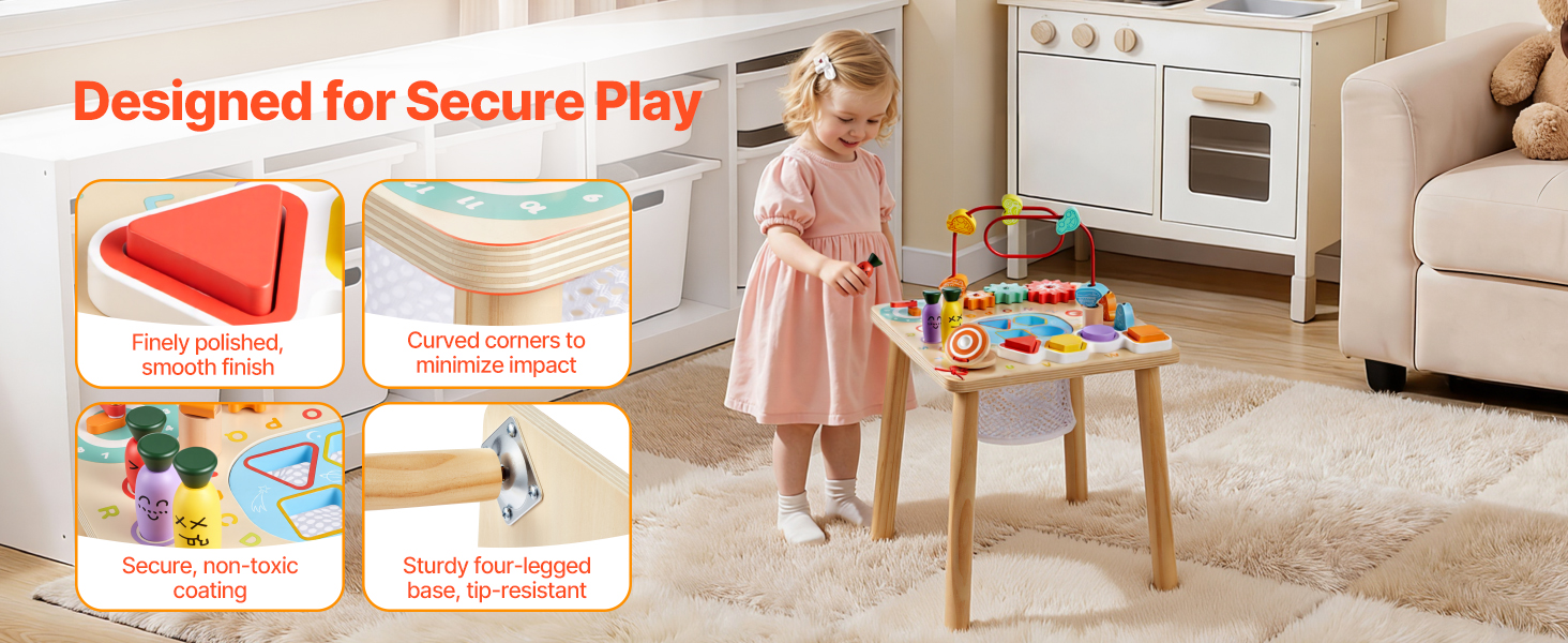 Tento stolík pre batoľatá má hladký povrch, zaoblené rohy a stabilnú štvornohú konštrukciu. Jeho dizajn pomáha znižovať nárazy a prevrátenie, takže malé rúčky môžu pohodlne objavovať, zatiaľ čo dospelí sa môžu cítiť pokojne.