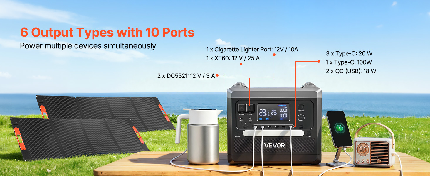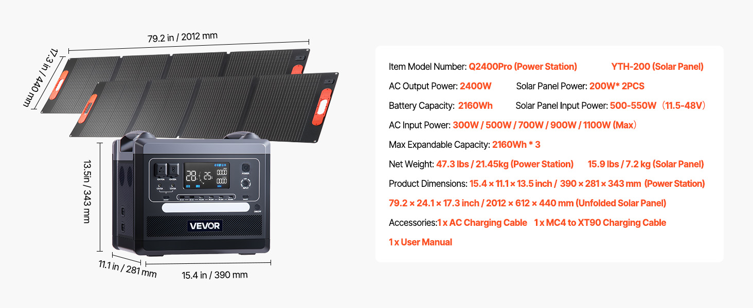 Prenosná elektráreň VEVOR 2400 W s 2 ks * 200 W skladateľným solárnym panelom je vaším spoľahlivým riešením v oblasti napájania. S 10 výstupnými portmi, vysokokapacitnou batériou LiFePO₄ s kapacitou 2160 Wh a rozširovateľnou kapacitou poskytuje nepretržité a spoľahlivé napájanie. Ideálna pre domáce zálohovanie, kempovanie v prírode a rodinné výlety.