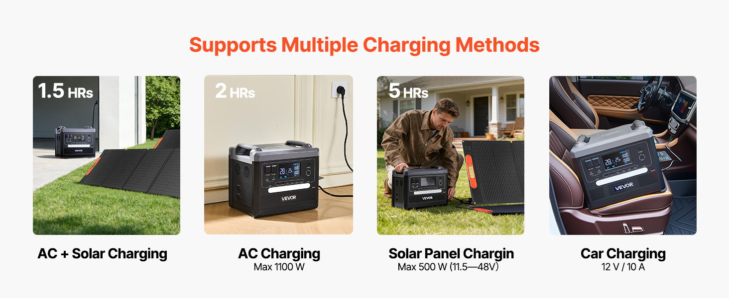 Podporuje nabíjanie striedavým prúdom, solárnou energiou a z auta, čím vám poskytuje viacero flexibilných spôsobov, ako mať elektráreň pripravenú kdekoľvek sa nachádzate.