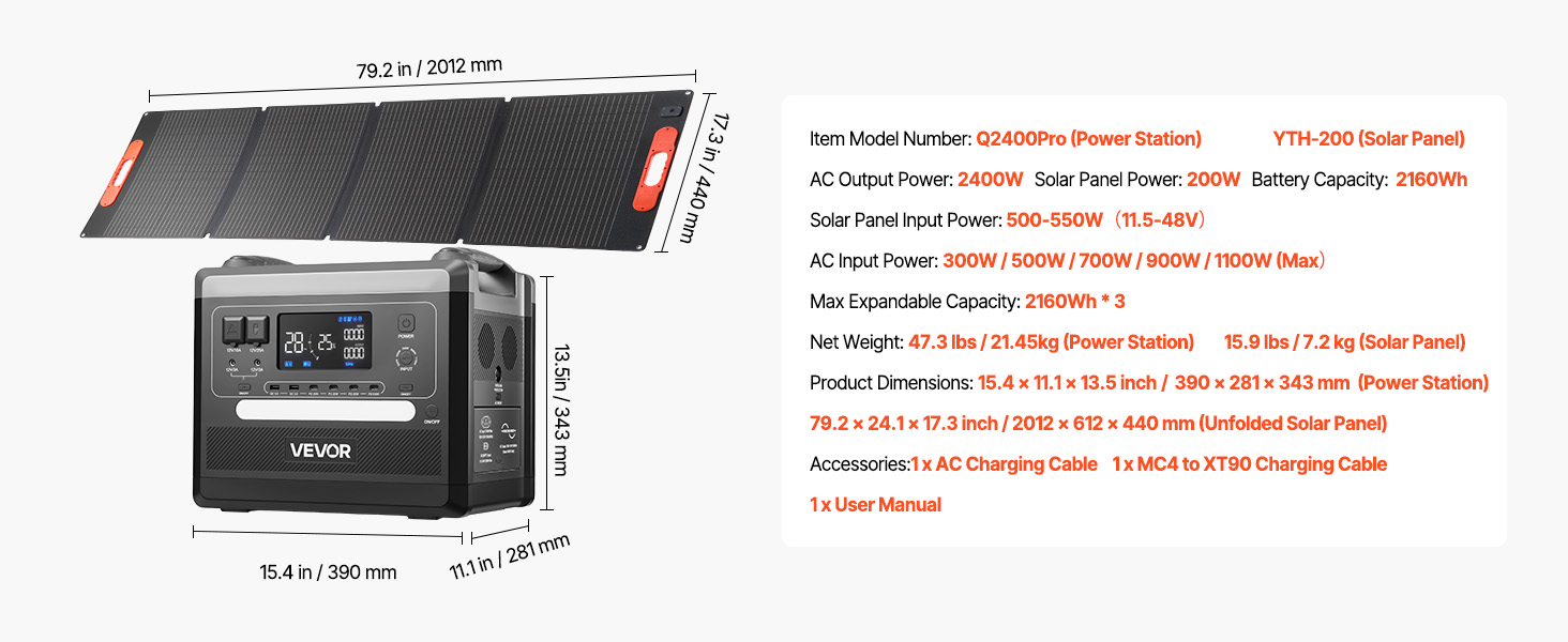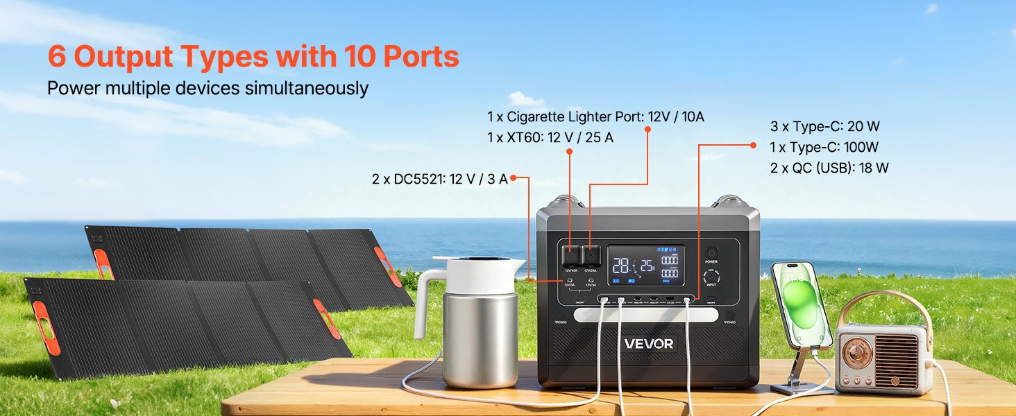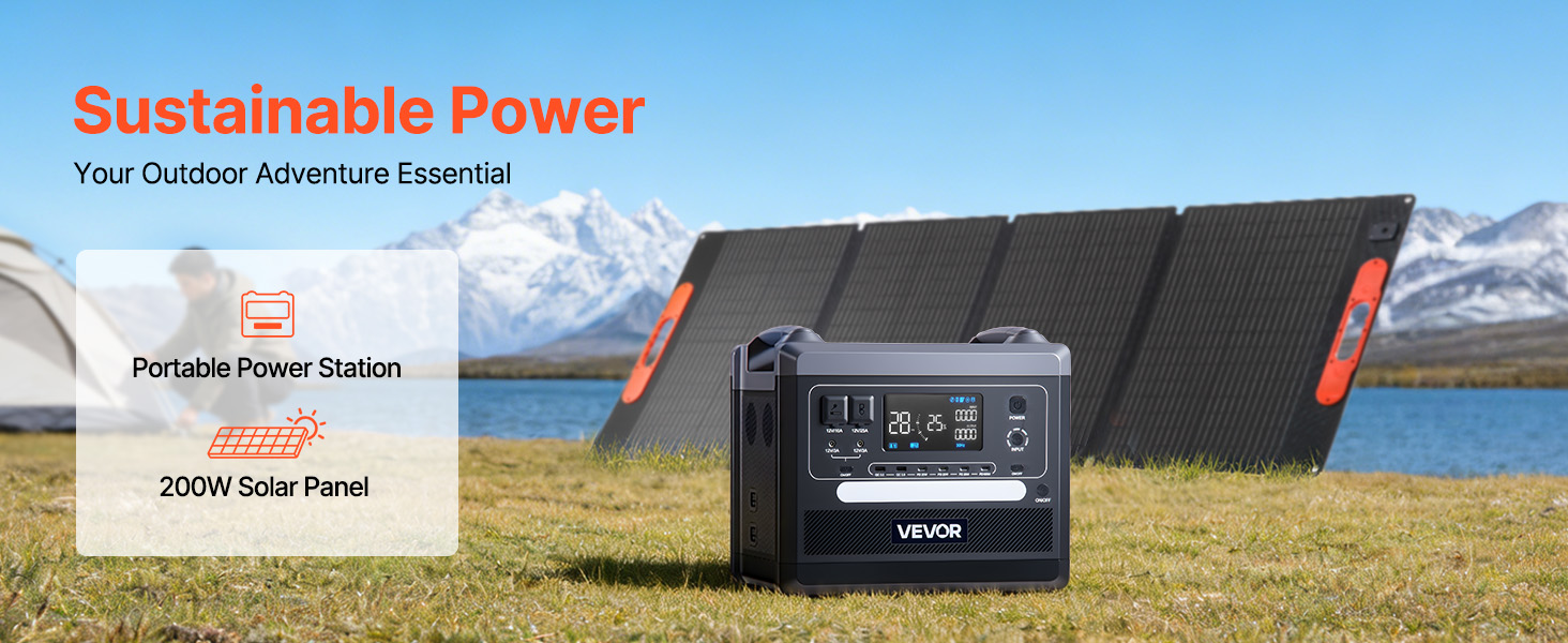 Prenosná elektráreň VEVOR 2400 W so skladacím solárnym panelom 200 W je vaším spoľahlivým riešením v oblasti napájania. S 10 výstupnými portmi, vysokokapacitnou batériou LiFePO₄ s kapacitou 2160 Wh a rozširovateľnou kapacitou poskytuje nepretržité a spoľahlivé napájanie. Ideálna pre domáce zálohovanie, kempovanie v prírode a rodinné výlety.