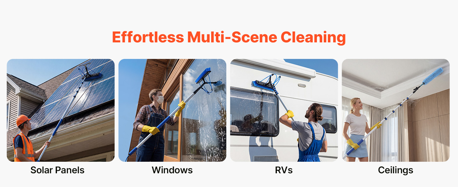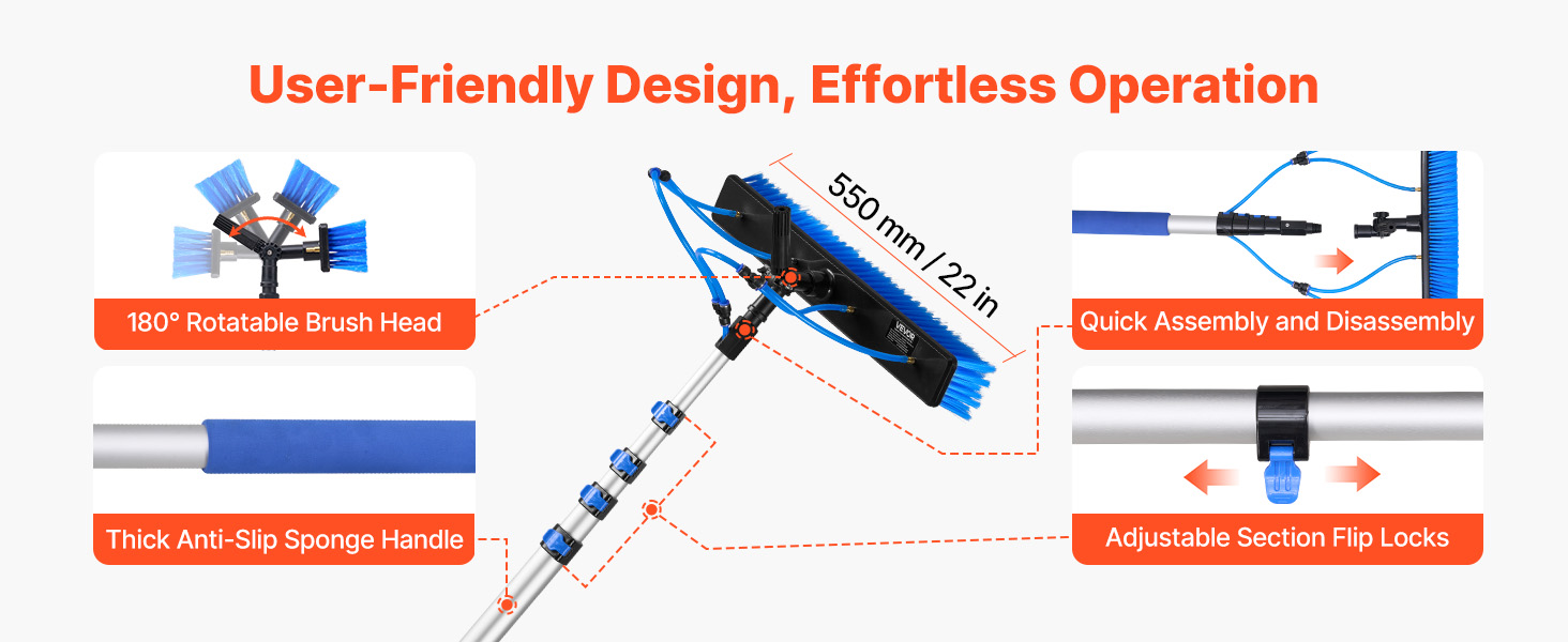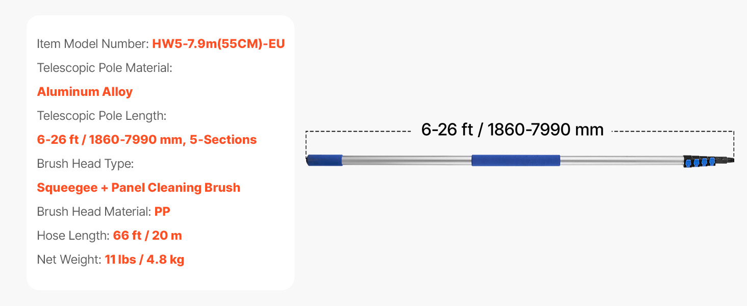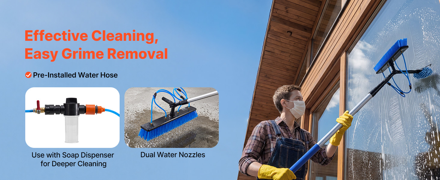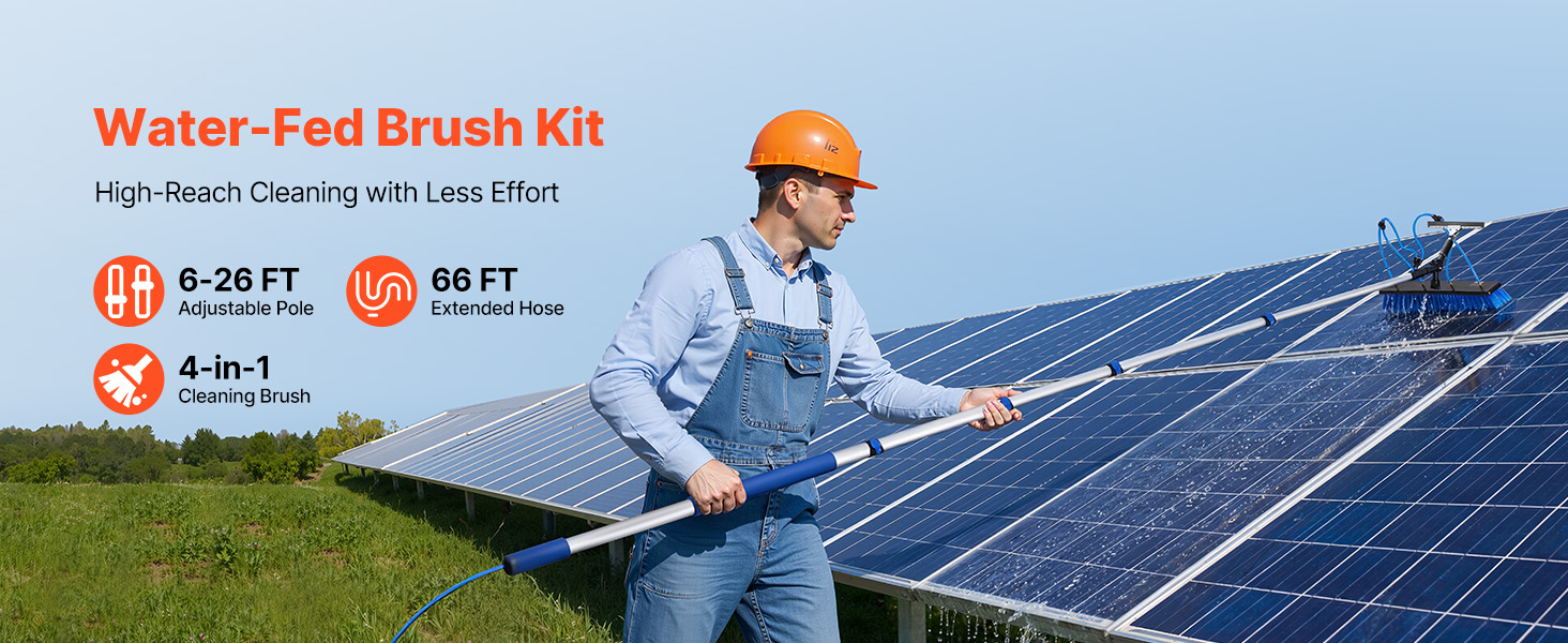 Táto súprava s tyčou napájanou vodou je vybavená nastaviteľnou tyčou s dĺžkou až 26 stôp. Vďaka otočnej kefovej hlave s rozsahom 180° a dvojitým výstupom vody umožňuje komplexné čistenie. Súprava obsahuje aj rýchlospojky a hadicu s dĺžkou 65,6 stôp pre pohodlné nastavenie, vďaka čomu je ľahké zvládnuť rôzne úlohy pri čistení.
