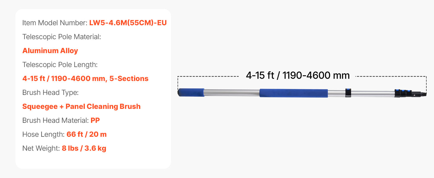 | Dĺžka teleskopickej tyče | 4–15 ft / 1190–4600 mm, 5 častí |