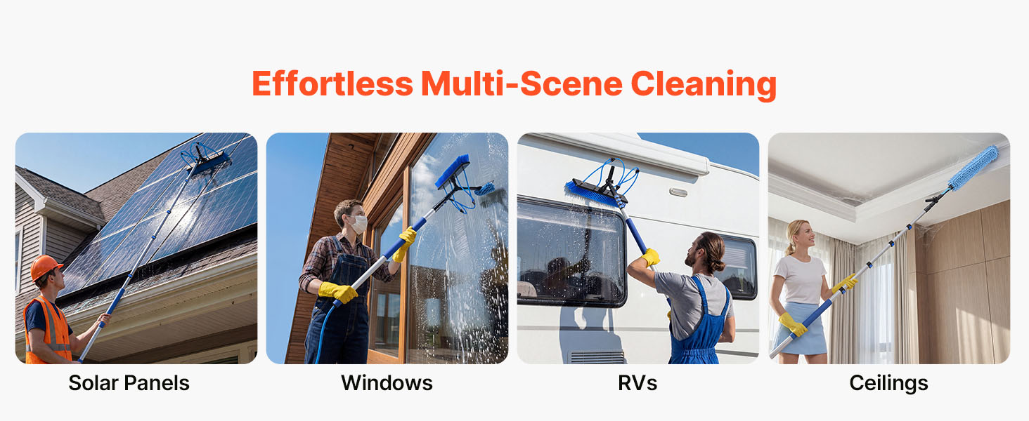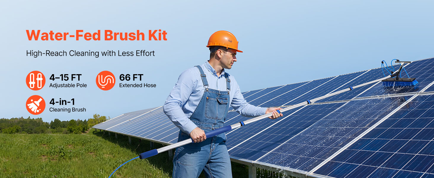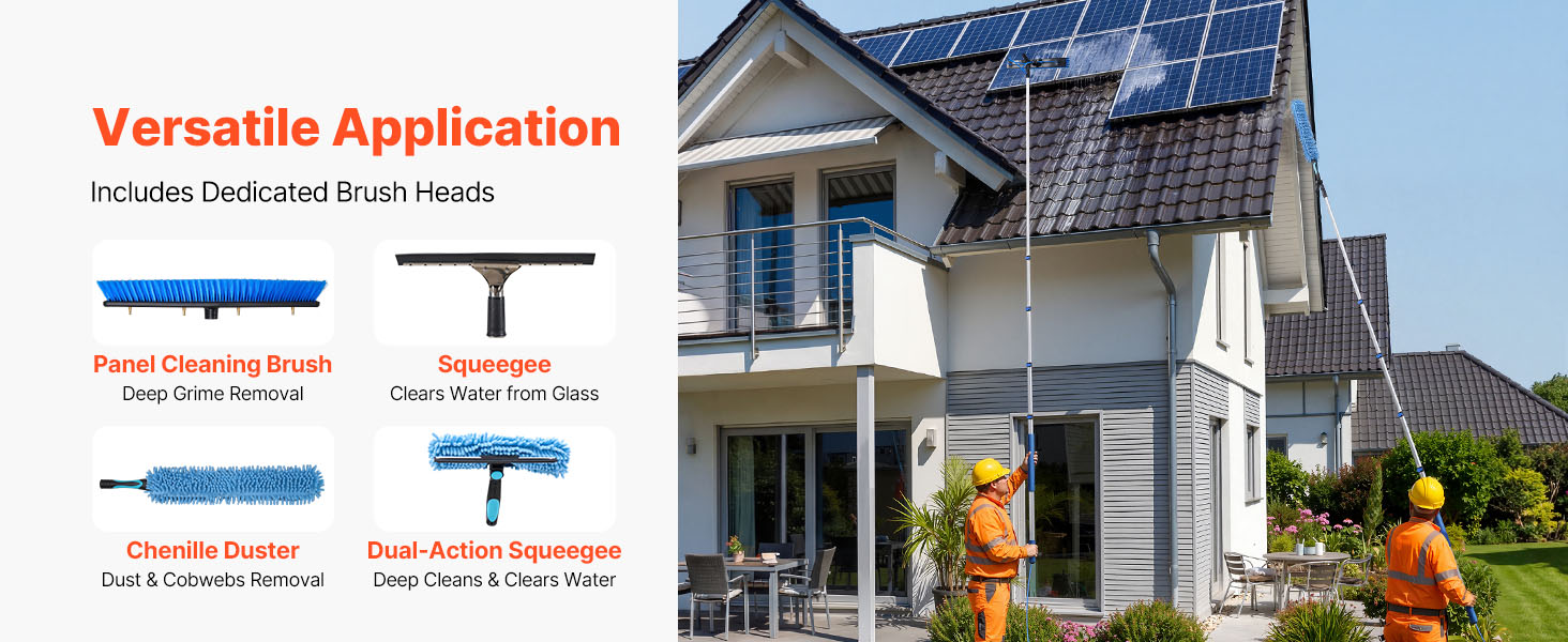 Táto multifunkčná sada kefy a tyče na čistenie solárnych panelov je vhodná pre rôzne prostredia, vrátane domovov a záhrad. Účinne čistí solárne panely, okná, stropy, zimné záhrady, karavany a billboardy.