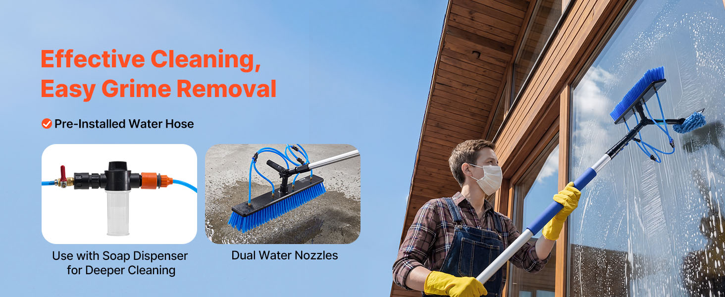 Naša kefa na tyči s prívodom vody sa dodáva s viacerými kefovými hlavicami pre rôzne povrchy. Dôkladne čistí odolné nečistoty, jemne stiera vodné škvrny zo sklenených povrchov a ľahko odstraňuje prach a pavučiny.
