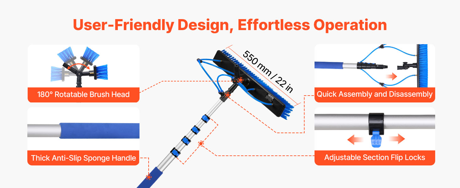 Táto kefa na solárne panely sa ľahko montuje a demontuje. Vďaka otočnej kefovej hlave s uhlom 180° a šírkou 22 palcov poskytuje širší rozsah čistenia. Hrubá penová rukoväť ponúka pohodlné uchopenie pre jednoduché a efektívne čistenie.