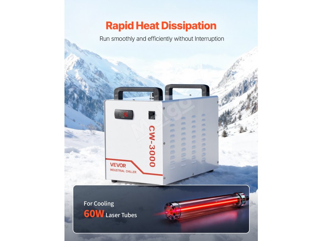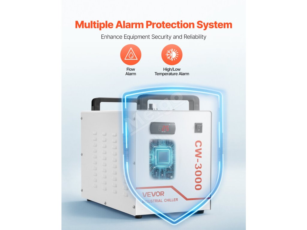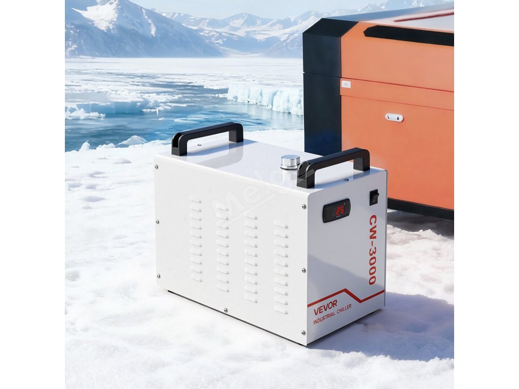 Tento priemyselný chladič je vybavený účinným chladiacim ventilátorom v kombinácii s výkonným vodným čerpadlom, ktoré rýchlo cirkuluje vodu a efektívne odvádza teplo. Zabezpečuje stabilnú prevádzku laserových gravírovacích strojov a CNC strojov. Viacnásobné alarmové funkcie poskytujú dodatočnú ochranu. Ideálny na chladenie 60 W laserových trubíc.