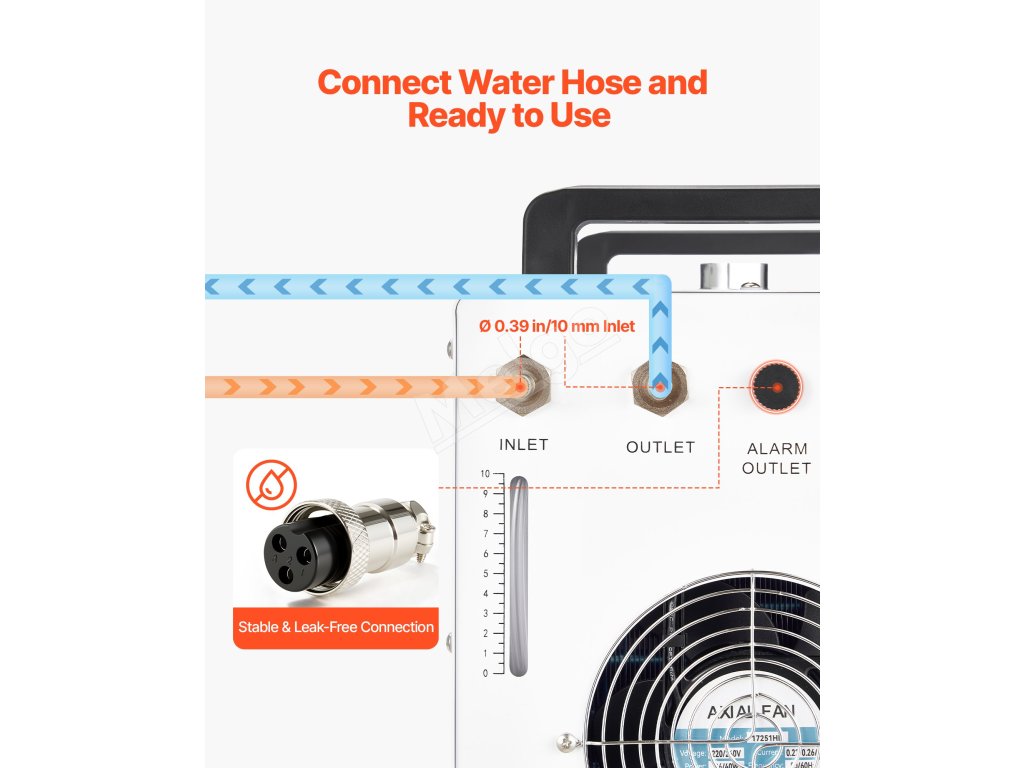 Náš priemyselný chladiaci stroj má štandardné priemerové vstupné a výstupné otvory, ktoré sú kompatibilné s väčšinou laserových gravírovacích strojov, CNC strojov a iných priemyselných zariadení. Zabezpečuje jednoduché pripojenie bez dodatočných adaptérov.
