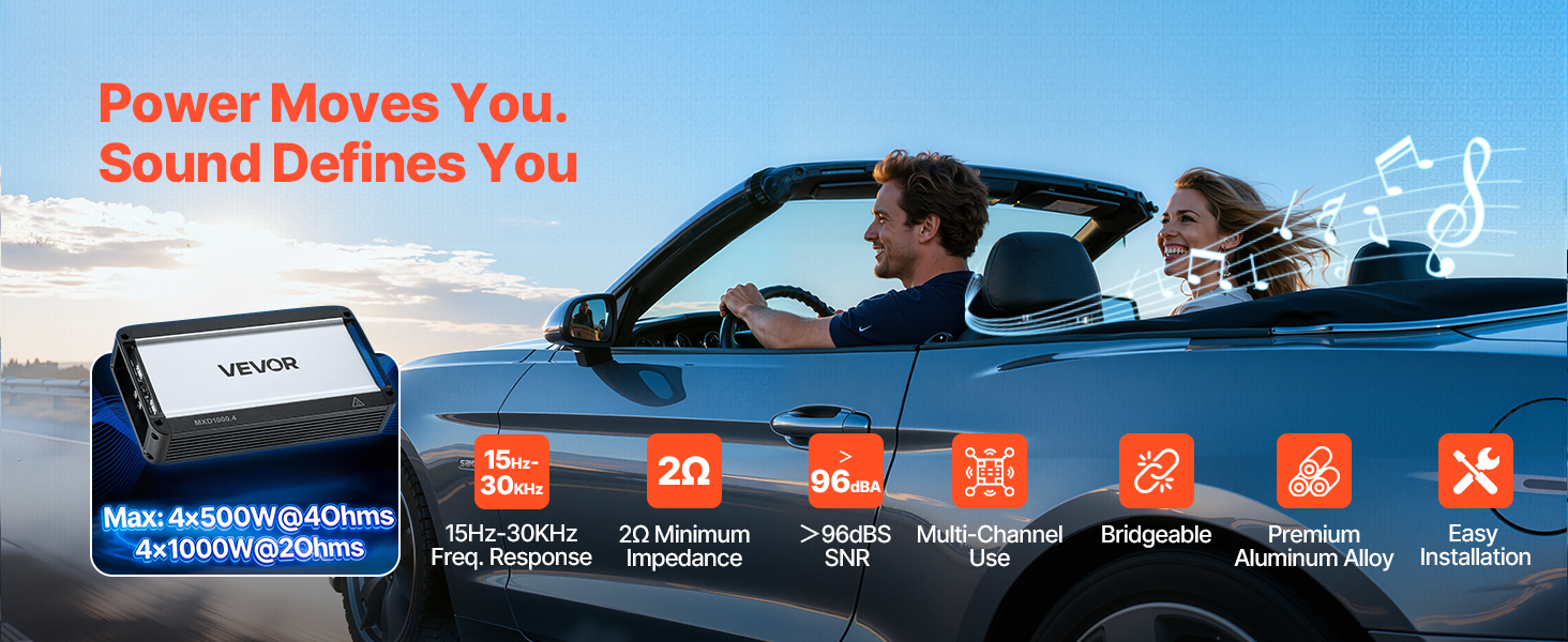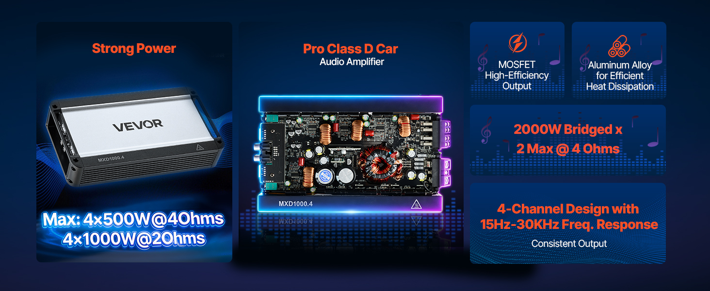 Tento viackanálový zosilňovač pre autorádio ponúka vysoký výkon, čistý zvuk s nízkym skreslením a mostovateľné kanály. Vďaka vysokému pomeru signálu k šumu, plynulému výkonu triedy D a odvodu tepla z hliníkovej zliatiny sa hodí do rôznych vozidiel a ľahko sa inštaluje – je ideálny pre každodenné jazdenie aj pre audio nadšencov.