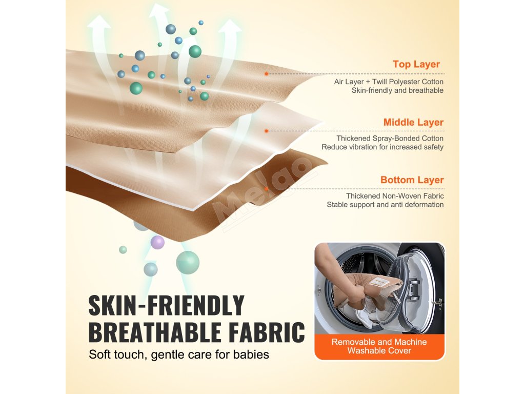 Naše detské hojdacie kresielko je vyrobené z vysokokvalitných, priedušných materiálov, ktoré sú mäkké na dotyk a šetrné k pokožke vášho dieťaťa. Vďaka snímateľnému poťahu stoličky je čistenie hračka, čo umožňuje zaneprázdneným rodičom bez námahy udržiavať svieži priestor pre dieťatko.