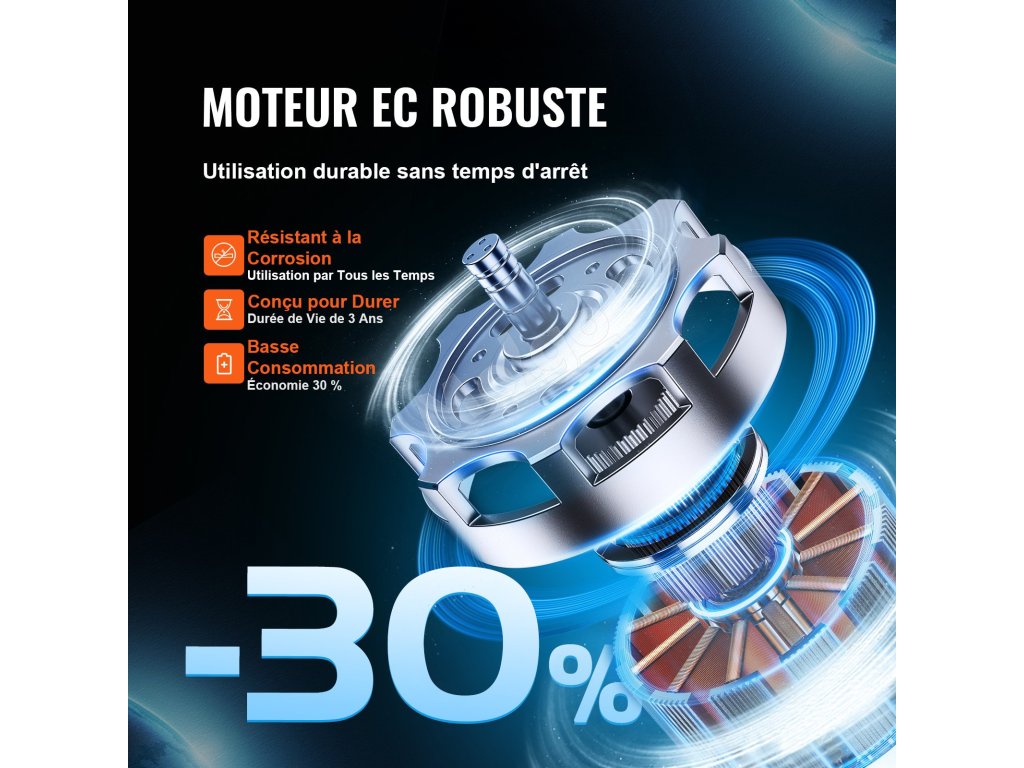 Náš ventilátor do potrubia poskytuje vyšší výkon ako striedavé motory a znižuje energetické straty o 30 %, čím zabezpečuje dlhú životnosť.