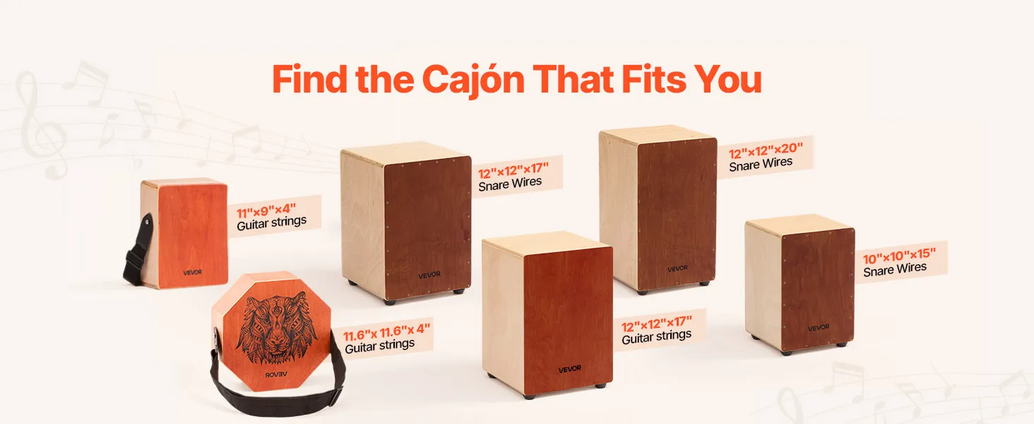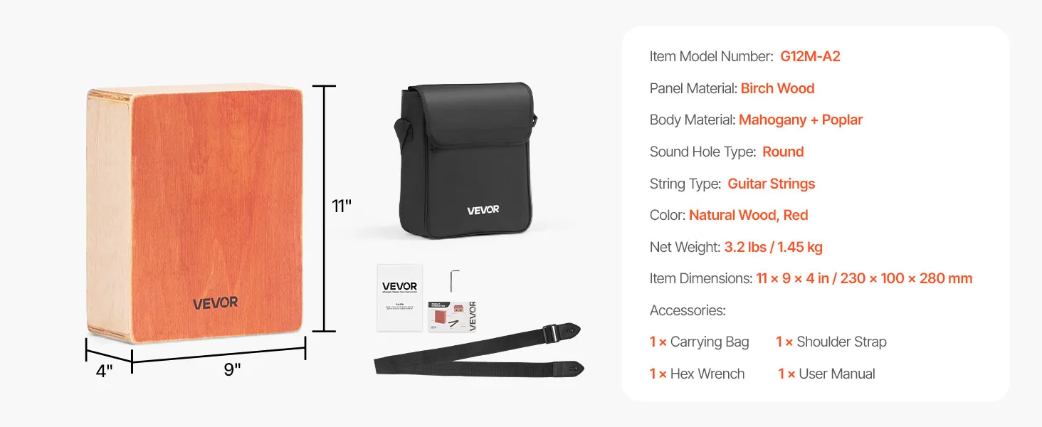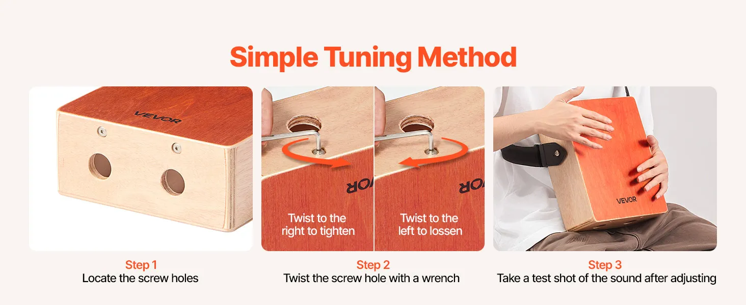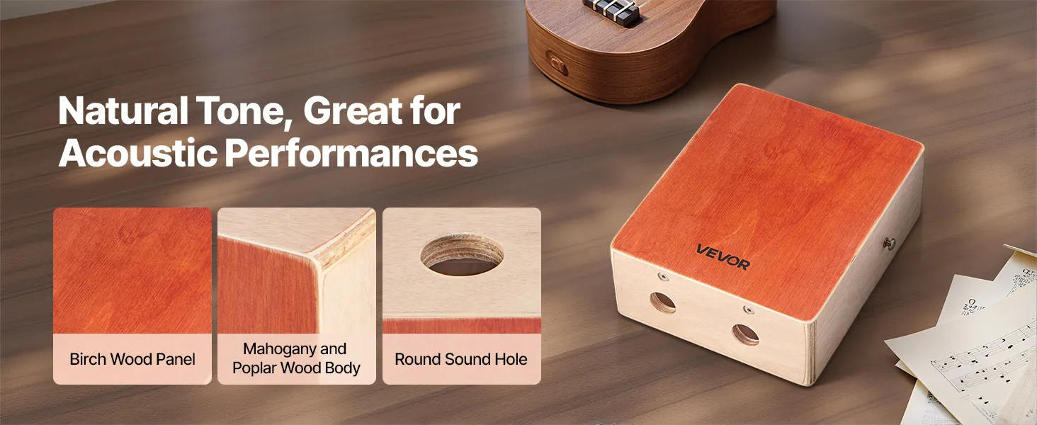 Vybrané brezové drevo poskytuje živú odozvu, zatiaľ čo zabudované nastaviteľné gitarové struny nášho box bubna sa hodia na pop, folk, jazz a latino groovy. Vďaka popruhu cez rameno, ktorý je súčasťou balenia, je pripravený na pouličné vystúpenia, sety na státie alebo hudbu na cestách.