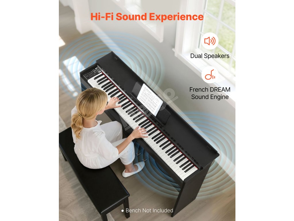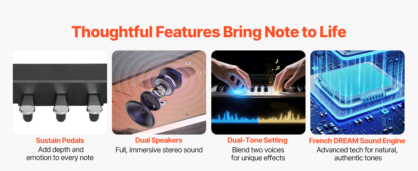 Pedál sustain predlžuje trvanie noty, vďaka čomu je hranie legata bezproblémové. Vďaka dvom reproduktorom, dvojtónovému nastaveniu a francúzskemu zvukovému motoru DREAM poskytuje toto elektrické piano 88 klávesov weighted bohatý, autentický zvuk, ktorý spĺňa potreby každého hráča.