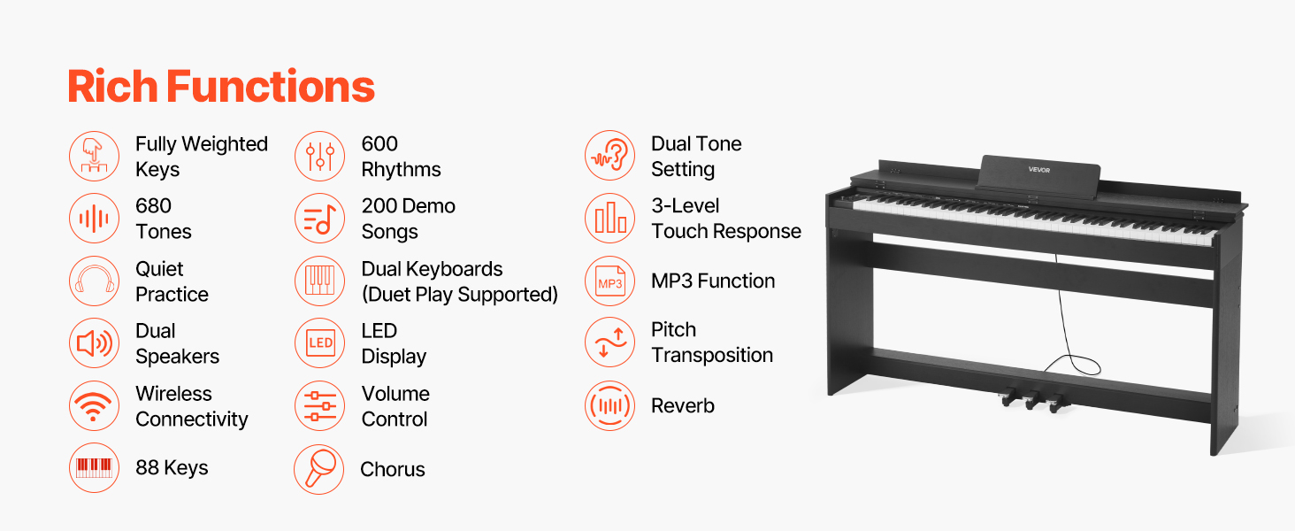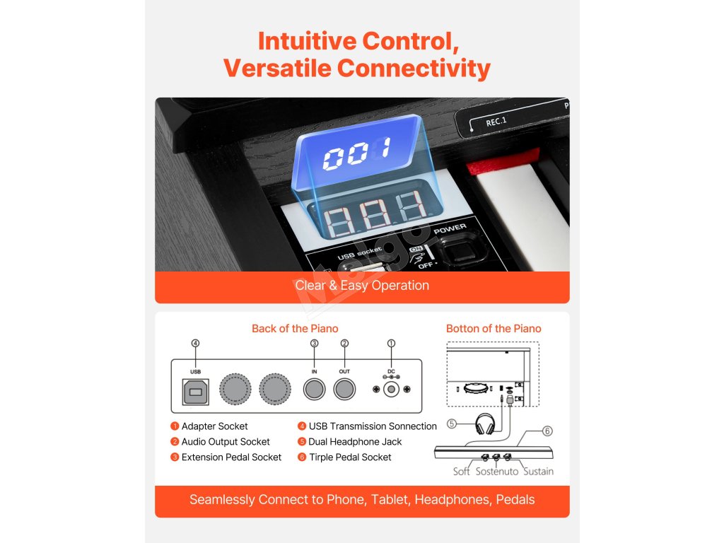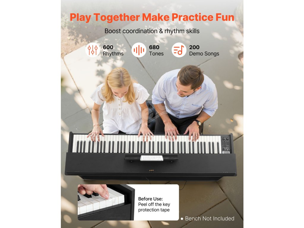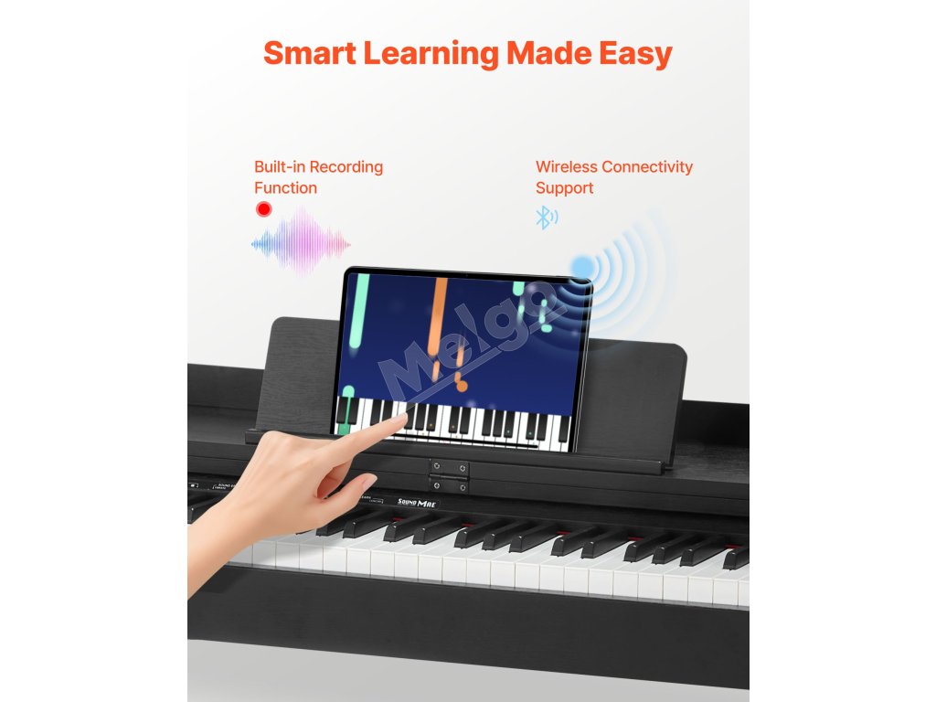 Tento 88-klávesový klavír s váženou klaviatúrou je ideálny na prechod z cvičenia na skutočné piano. Je vybavené duálnym režimom klaviatúry a 680 bohatými tónmi, má zabudované duálne reproduktory, podporu MIDI a Bluetooth, ako aj konektory na zvuk, mikrofón a slúchadlá. Vykročte s dôverou do sveta hudby!