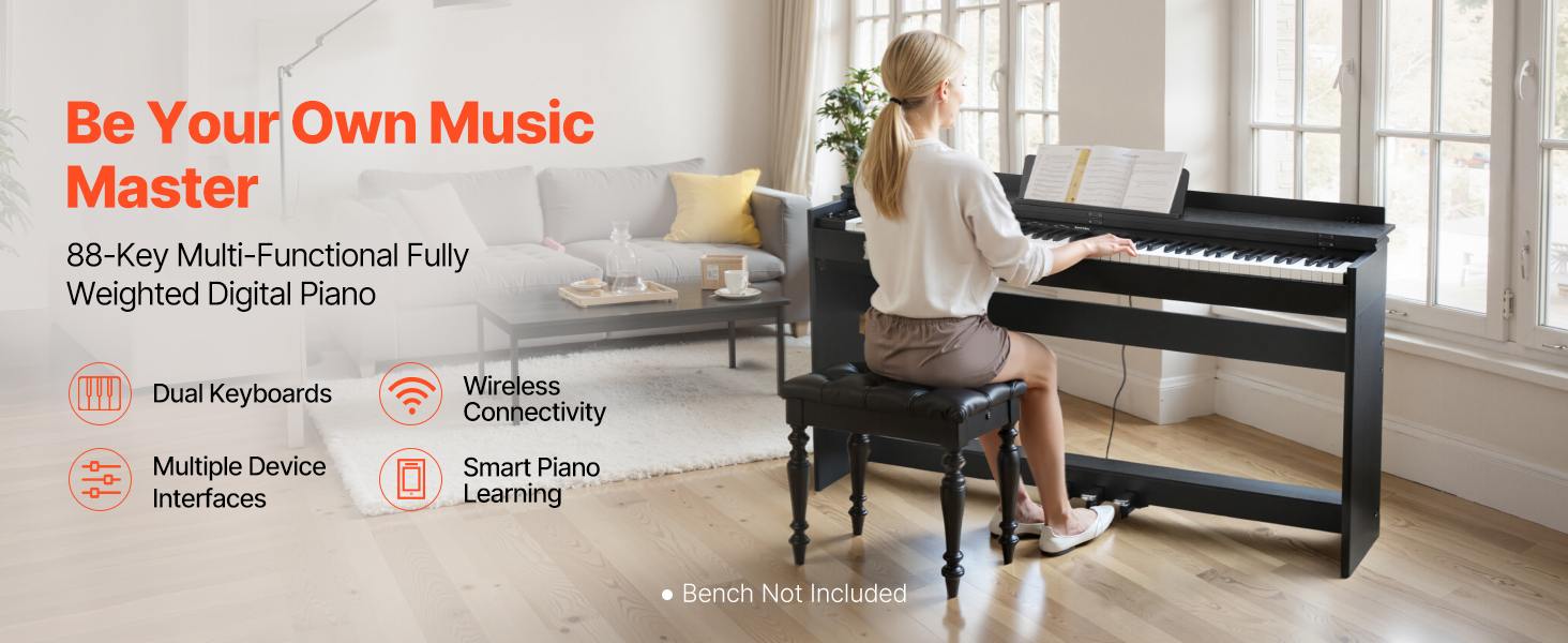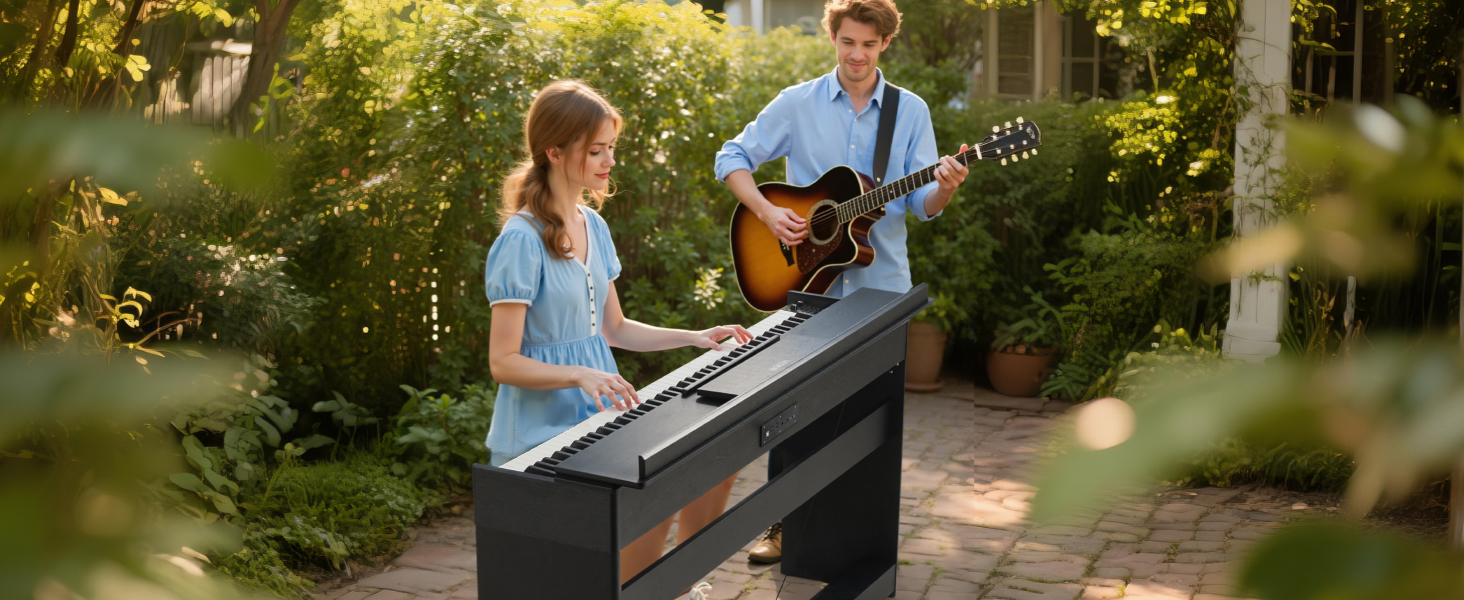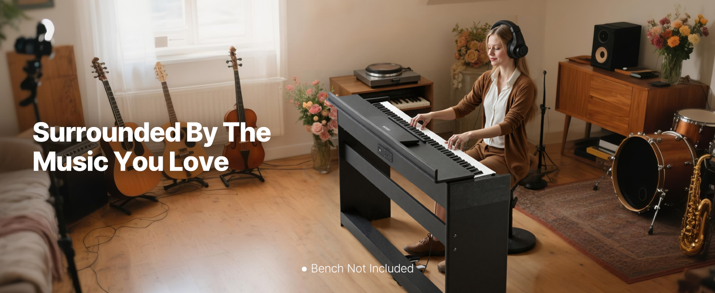 V porovnaní s akustickým klavírom je naša 88-klávesová vážená klaviatúra ľahšia a ľahšie sa prenáša, čo vám umožní umiestniť ju kamkoľvek budete chcieť. Môžete tiež hrať spoločne s priateľmi alebo blízkymi a ľahko si užívať čas strávený pri hudbe.