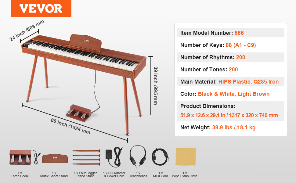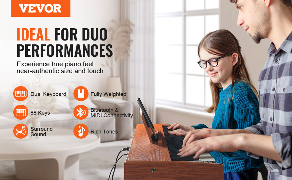 Toto 88-klávesové plne zaťažené digitálne piano je vybavené režimom dvojitej klaviatúry pre profesionálnych hráčov a dokáže zahrať 200 tónov. Vďaka zabudovaným duálnym reproduktorom, podpore prenosu MIDI a Bluetooth, konektorom pre zvuk a mikrofón si môžete pripojiť slúchadlá pre pohlcujúce učenie a vstúpiť do sveta hudby!