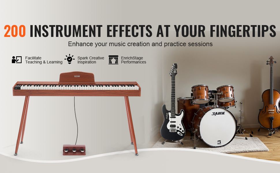 Digitálne piano dokáže prehrávať efekty 200 nástrojov. Začiatočníci ho ľahko pochopia a nadviažu na rôzne nástroje a rytmy. Môžete ho použiť aj na obohatenie svojich pódiových vystúpení a vytváranie viacštýlových skladieb.