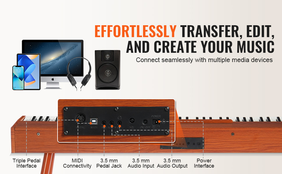 Elektrické piano podporuje rozhranie bluetooth a prenos MIDI. Zároveň je k dispozícii viacero rozhraní, takže môžete pristupovať k sustain pedálu, slúchadlám, mikrofónu, počítaču atď. a ľahko tak upravovať a vytvárať svoju hudbu.