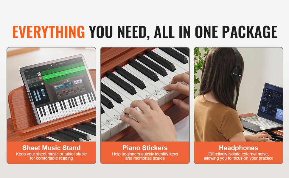 Digitálne piano s 88 klávesmi s váhou sa dodáva so stojanom na noty, ktorý pomáha udržať noty alebo plochý počítač stabilné a pohodlné na čítanie. Vysokokvalitné slúchadlá účinne izolujú vonkajší hluk, čo vám umožní sústrediť sa na ponorenie sa do sveta hudby!