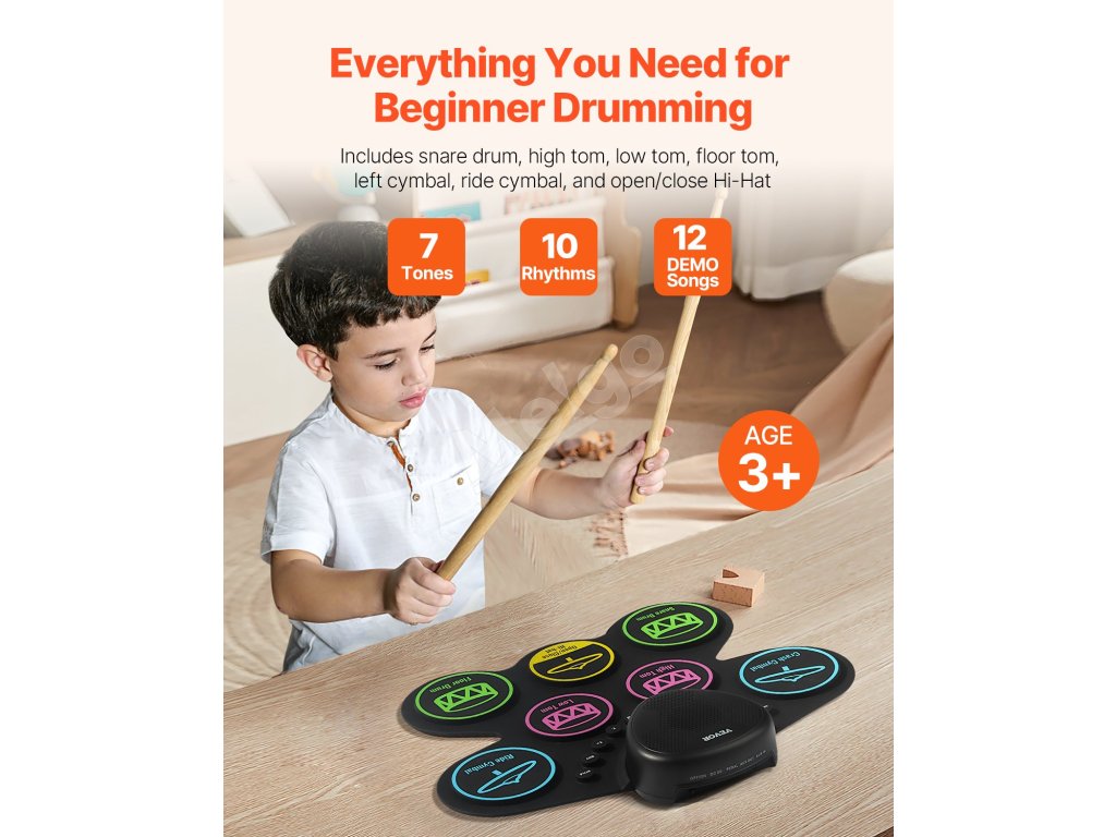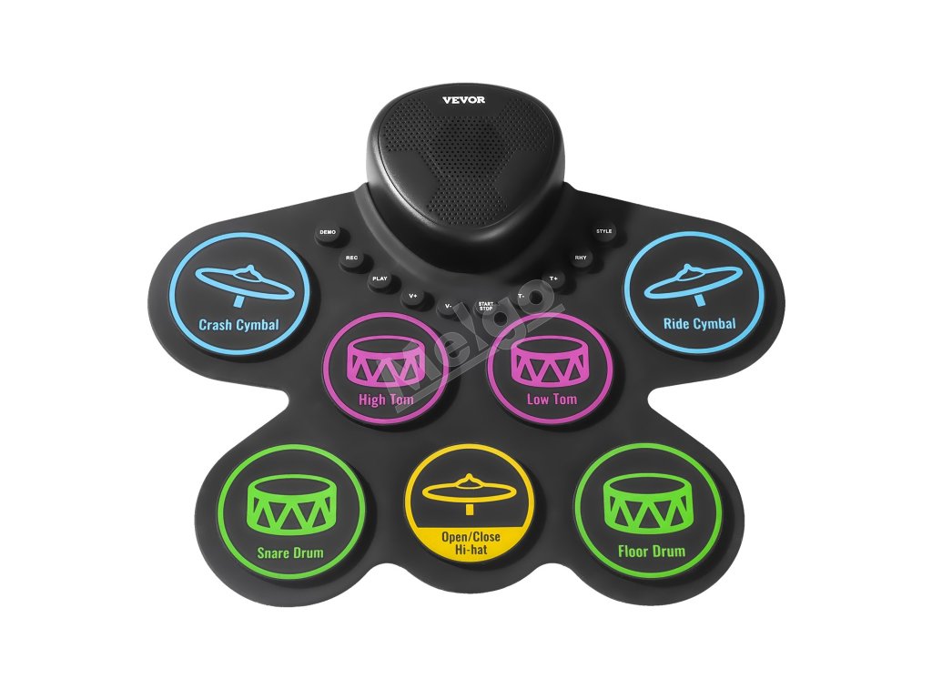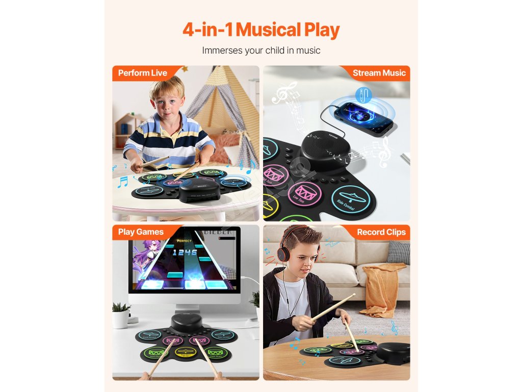 Naša elektrická bicia súprava obsahuje 7 padov a 2 pedále, ktoré podporia perkusívne zručnosti vášho dieťaťa. Podporuje živé vystúpenia, prehrávanie hudby, hry DTX a nahrávanie. Vďaka konektoru na slúchadlá, udržateľnému silikónu a 1000 mAh dobíjacej batérii sa stane pre vaše dieťa pomôckou na cvičenie kdekoľvek.