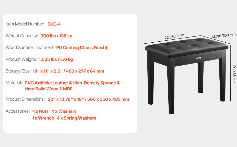 22" x 13,78" x 19" Klavírna lavica s úložným priestorom