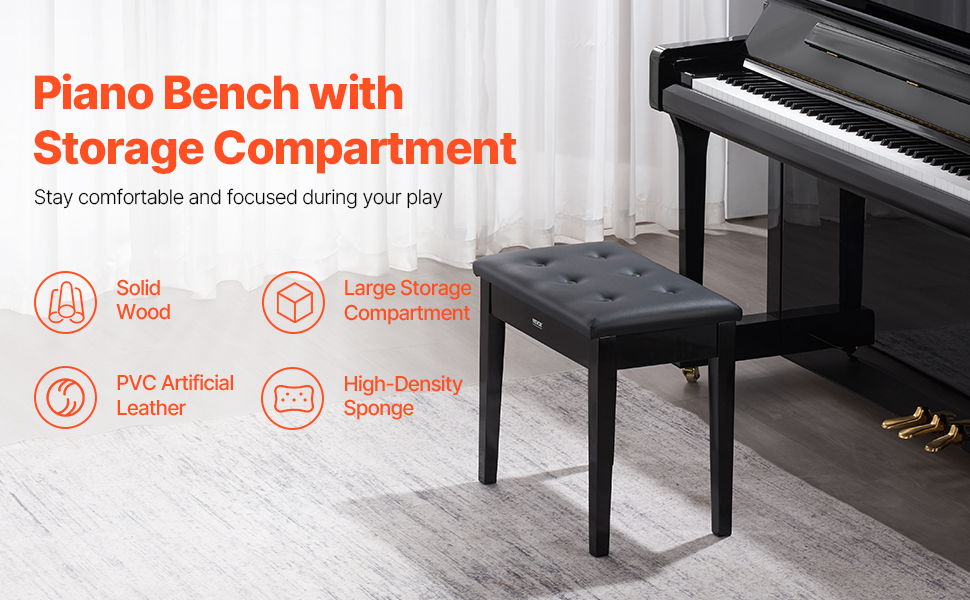 Táto klavírna lavica je navrhnutá pre pohodlie, má široké sedadlo a čalúnený vankúš. Je vybavená veľkým úložným priestorom, do ktorého pohodlne uložíte noty a príslušenstvo. Vďaka protišmykovým gumovým podložkám na základni je lavica stabilná na hladkých podlahách.