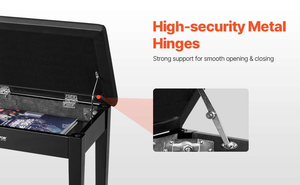 Táto klavírna stolička navrhnutá s prvotriednymi kovovými závesmi poskytuje stabilnú oporu a plynulý chod vždy, keď ju otvárate alebo zatvárate. Tieto odolné pánty umožňujú ľahký prístup k úložnému priestoru a zároveň minimalizujú hluk a trenie, čím zlepšujú váš zážitok z hry.