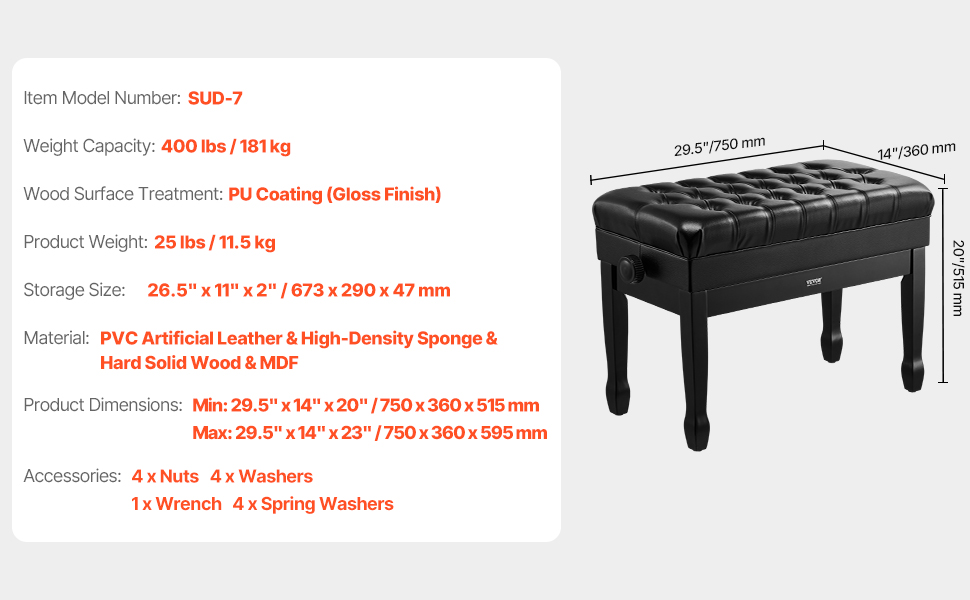 29.nastaviteľná klavírna lavica s úložným priestorom 5" x 14" x 20"