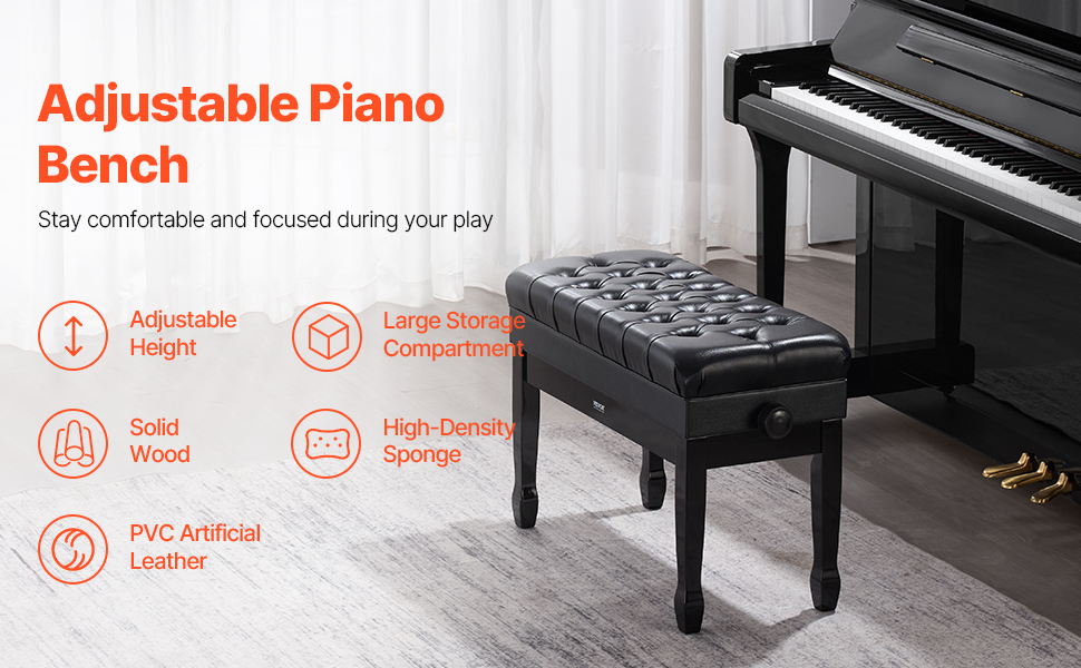 Táto duetová klavírna lavica ponúka priestranné sedadlo s nastaviteľnou výškou v rozsahu 20,3" až 23,4". Polstrované sedadlo so špongiou s vysokou hustotou poskytuje pohodlie počas dlhých sedení, zatiaľ čo veľký úložný priestor poskytuje prehľadný priestor na noty a iné príslušenstvo.