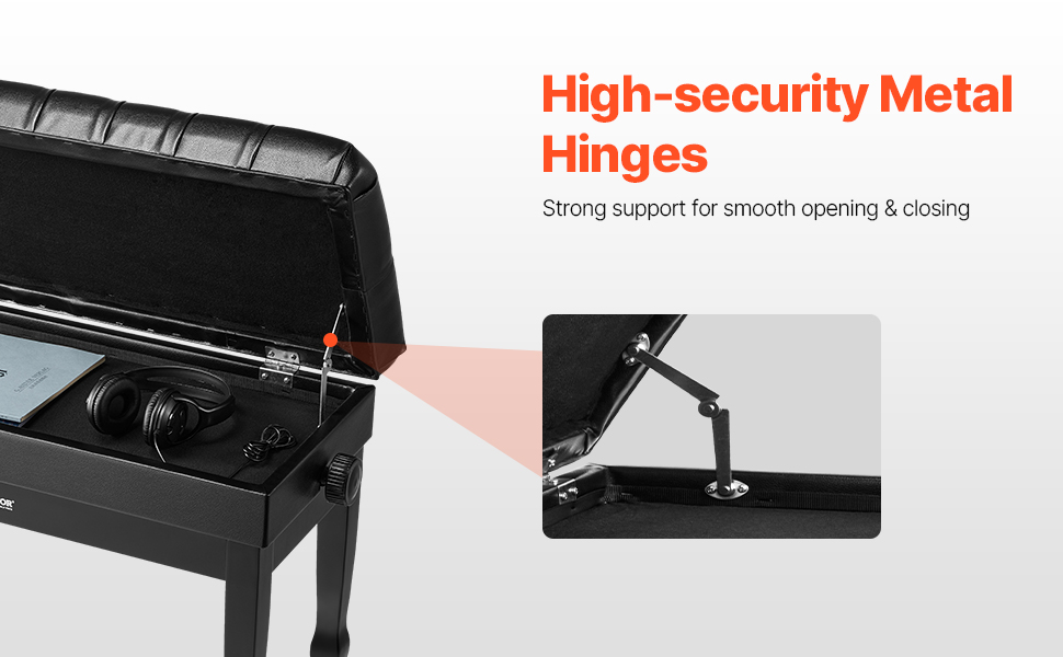 Táto klavírna stolička navrhnutá s prvotriednymi kovovými závesmi poskytuje stabilnú oporu a hladký chod vždy, keď ju otvárate alebo zatvárate. Tieto odolné pánty umožňujú ľahký prístup k úložnému priestoru a zároveň minimalizujú hluk a trenie, čím zlepšujú váš zážitok z hry.