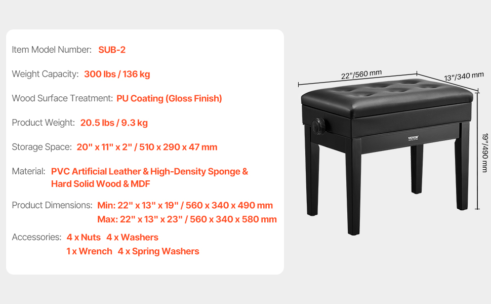 nastaviteľná klavírna lavica s úložným priestorom 22" x 13" x 19,3"