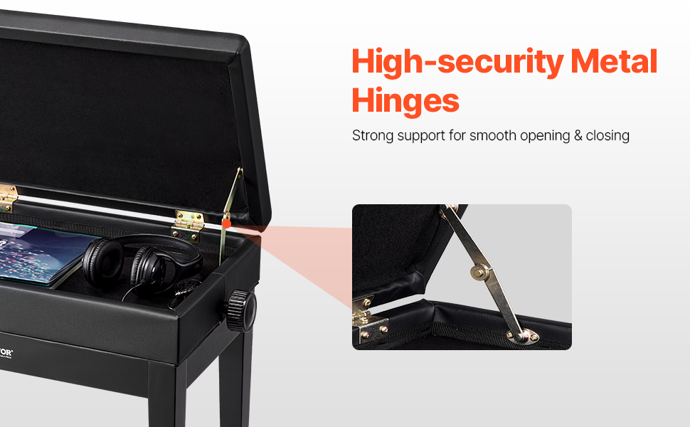 Táto klavírna stolička navrhnutá s prvotriednymi kovovými závesmi poskytuje stabilnú oporu a hladký chod vždy, keď ju otvárate alebo zatvárate. Tieto odolné pánty umožňujú ľahký prístup k úložnému priestoru a zároveň minimalizujú hluk a trenie, čím zlepšujú váš zážitok z hry.