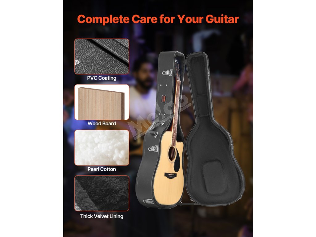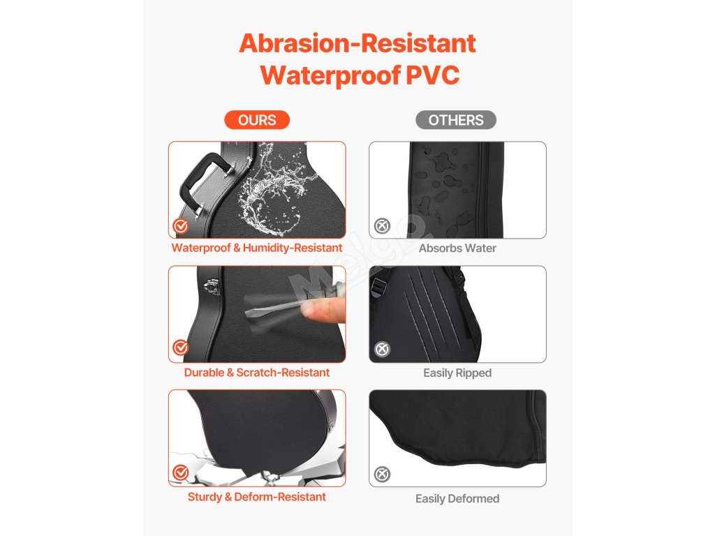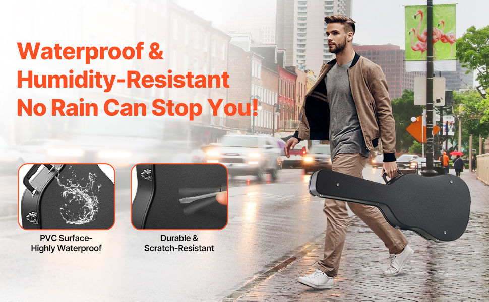 Toto tvrdé puzdro na gitaru v tvare tekvice, vybavené vonkajším povrchom potiahnutým PVC, je vodotesné a odolné voči vlhkosti, čím chráni vašu gitaru pred vlhkosťou a koróziou. Či už je slnečno, alebo prší, môžete ho bez obáv prenášať a hrať.