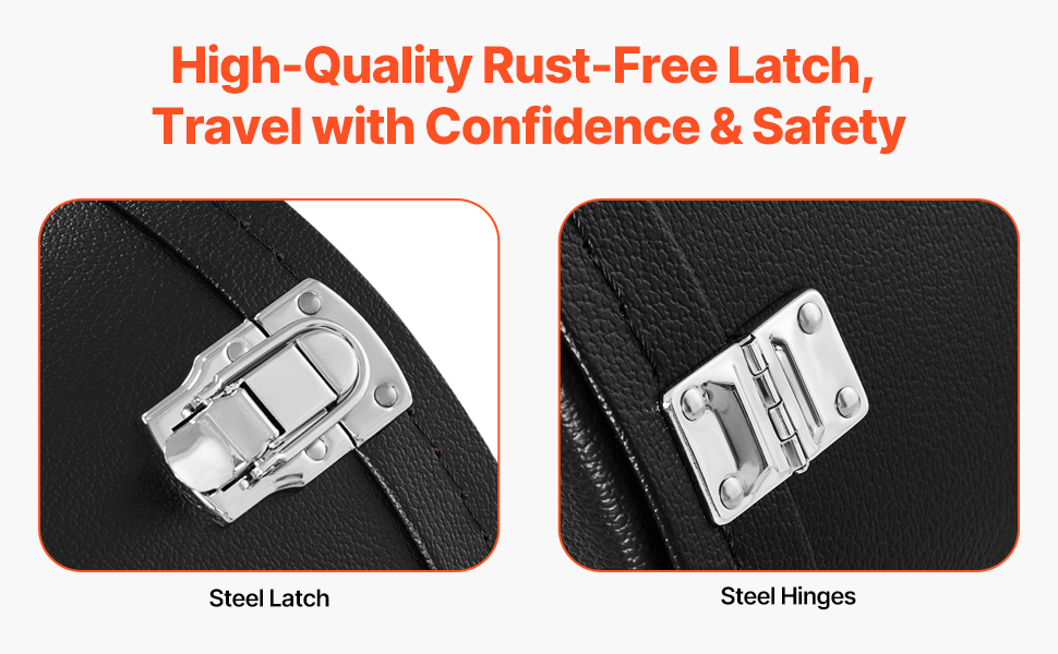 Náš vodotesný pevný kufor na gitaru je vybavený oceľovými západkami a pántmi, ktoré zabezpečia, že vaša gitara bude pevne držať na svojom mieste. Tieto robustné komponenty poskytujú spoľahlivú bezpečnosť, vďaka čomu budete mať počas prepravy a manipulácie pokoj.