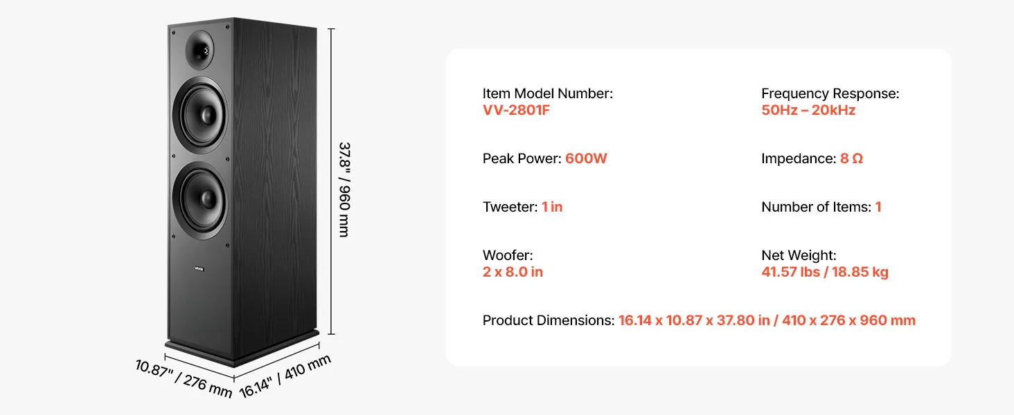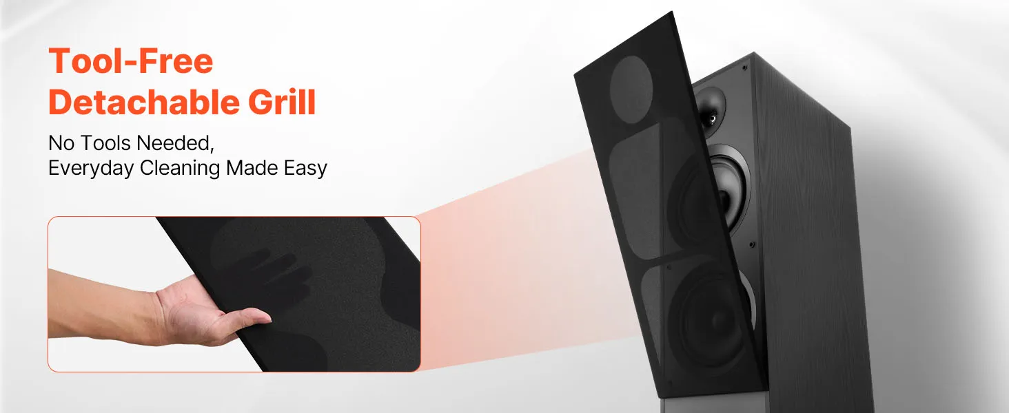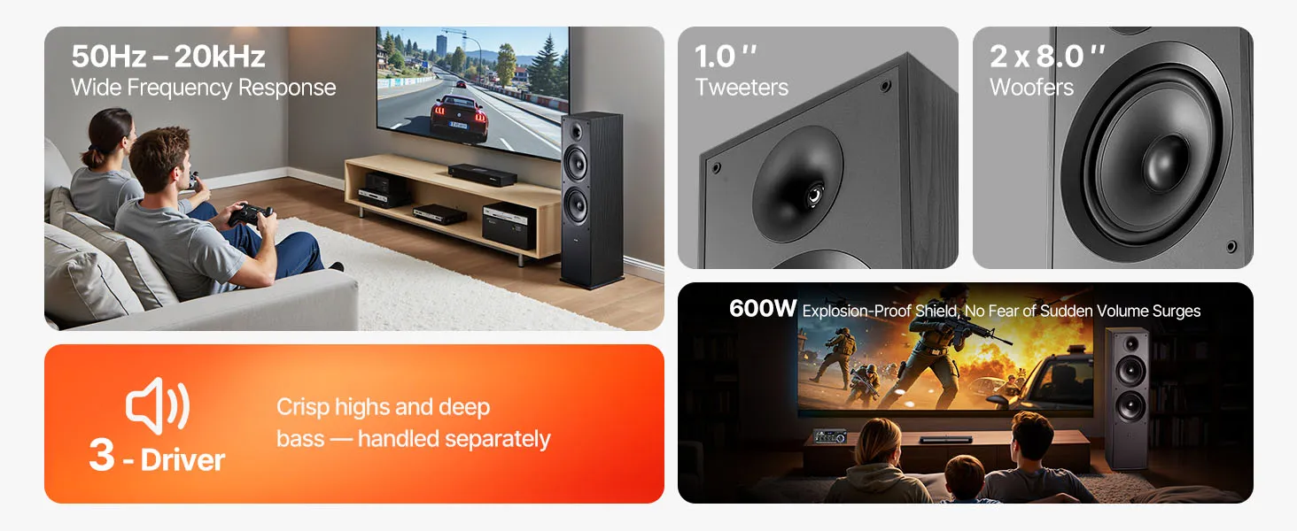 Pozdvihnite svoj domáci zvuk na vyššiu úroveň! Je vybavený 1-palcovým výškovým reproduktorom a dvoma 8-palcovými basovými reproduktormi, vďaka čomu poskytuje jasné výšky, bohaté stredy a hlboké basy. Skriňa z MDF minimalizuje rezonanciu pre čistý a presný zvuk a vďaka odnímateľnej mriežke je bežné čistenie hračkou.