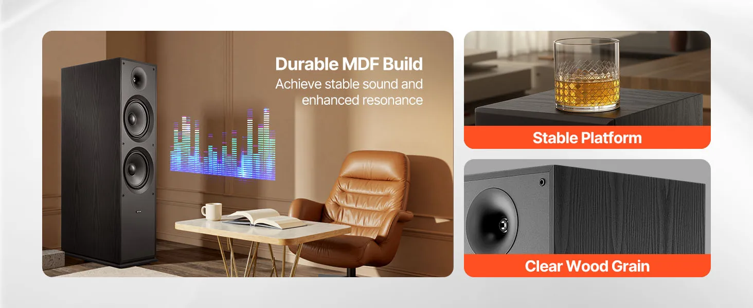 Skriňa MDF nášho stojaceho vežového reproduktora znižuje nežiaduce rezonancie a vibrácie a poskytuje čistejší a presnejší zvukový výkon.