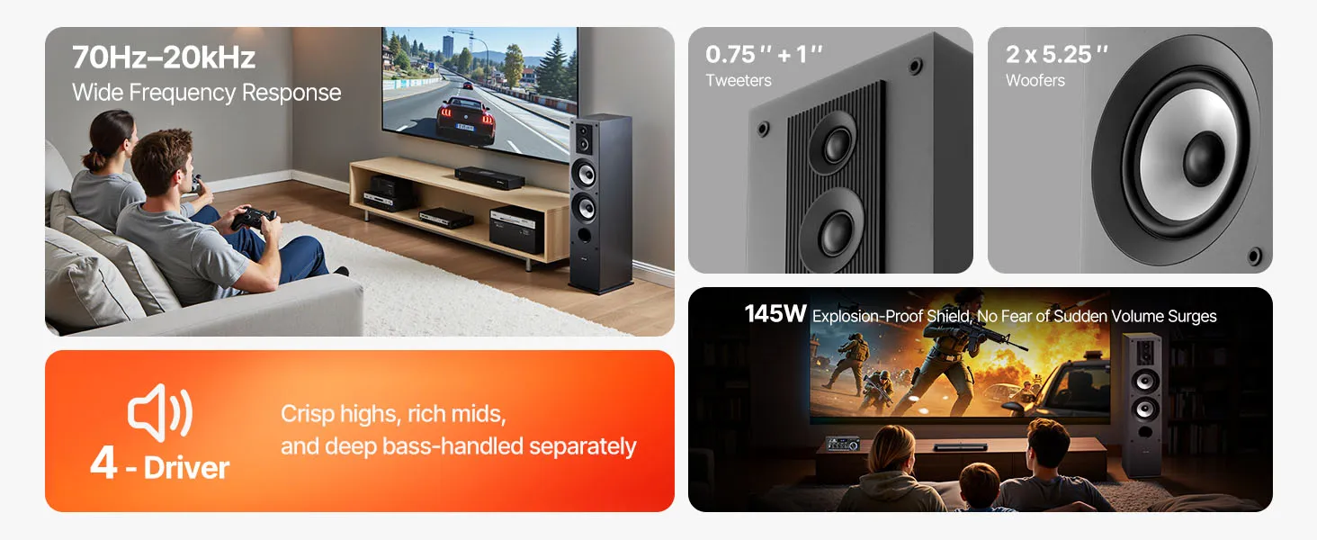 Pozdvihnite svoj domáci zvuk na vyššiu úroveň! Je vybavený 0,75-palcovým supervýškovým reproduktorom, 1-palcovým výškovým reproduktorom a dvoma 5,25-palcovými basovými reproduktormi, vďaka čomu poskytuje jasné výšky, bohaté stredy a hlboké basy. Skriňa MDF minimalizuje rezonanciu pre čistý a presný zvuk a vďaka odnímateľnej mriežke je bežné čistenie hračkou.
